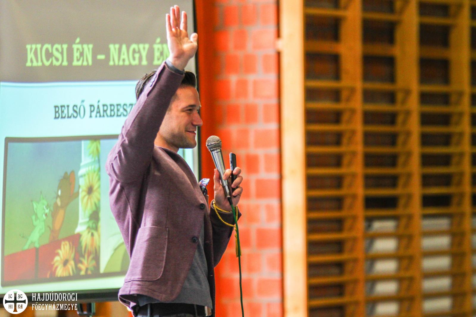 A következőkben az általános iskola tornatermében három, egymásra épülő előadást hallgathattunk meg görögkatolikus egyházunk szakembereitől és papjaitól. Soltész Ian coach prezentációs előadásában a 15-16 éves korosztályt az önmegismerés, önmegbecsülés és az önbizalom helyes megtalálására ösztönözte, illetve ezek elsajátítási technikájára helyezte a hangsúlyt, felhívva a figyelmet az emberi élet elsődleges, Istentől jövő céljára, a boldogságra.