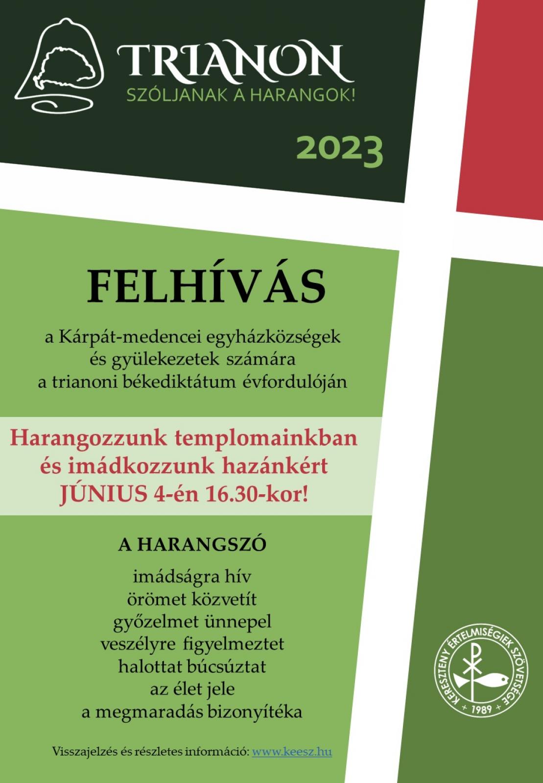 2023-ban is folytatjuk a trianoni békediktátum évfordulójához kapcsolódó hagyományunkat, ezért ismét hívjuk felekezettől függetlenül a Kárpát-medence magyar vallási közösségeit, hogy június 4-én, magyar idő szerint 16.30-kor harangozzunk templomainkban, majd imádkozzunk a magyar nemzet egységéért és a keresztény hit védelméért.