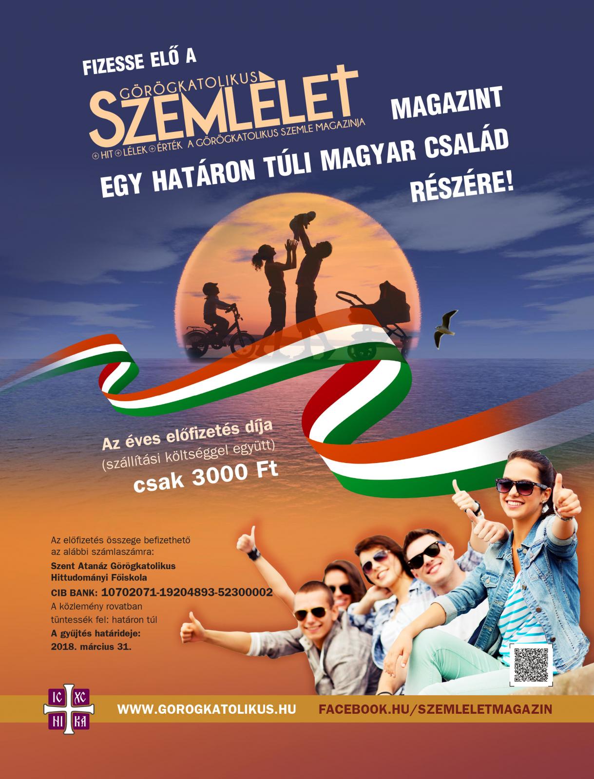Az elmúlt esztendőkben egyre több igény mutatkozott a Görögkatolikus Szemlélet Magazin olvasására az elszakított területeken élő magyar görögkatolikus testvéreinktől is, ezért 2018-tól a Metropólia területén kívül is kapható lesz magazinunk – tavaly már hetven új előfizetést jegyeztünk Szatmárnémeti környékéről. Bizonyára mindannyiunk előtt ismert tény, hogy főleg Kárpátalján, de több határon túli területen is gyakran igen nehéz körülmények között élnek testvéreink, ezért úgy döntöttünk, hogy a szokásos segélyszállítmányok mellett összetartozásunk és szolidaritásunk jeléül újfajta akciót indítunk: arra buzdítjuk híveinket, hogy fizessék elő egy évre a Görögkatolikus Szemlélet Magazint egy határon túli magyar család számára. Az éves előfizetés a postai költségekkel együtt csak 3000 Ft, mely egy évre elenyésző összeg, az evvel nyújtott élmény, a törődés, az összetartozás érzése viszont pénzben nem kifejezhető értékek. Határainkat, egyházmegyéinket noha szétszakították, bennünket egymástól nem lehet elválasztani. Ezt hivatott kifejezni ez a gesztus is, amire hívjuk a görögkatolikus híveket.