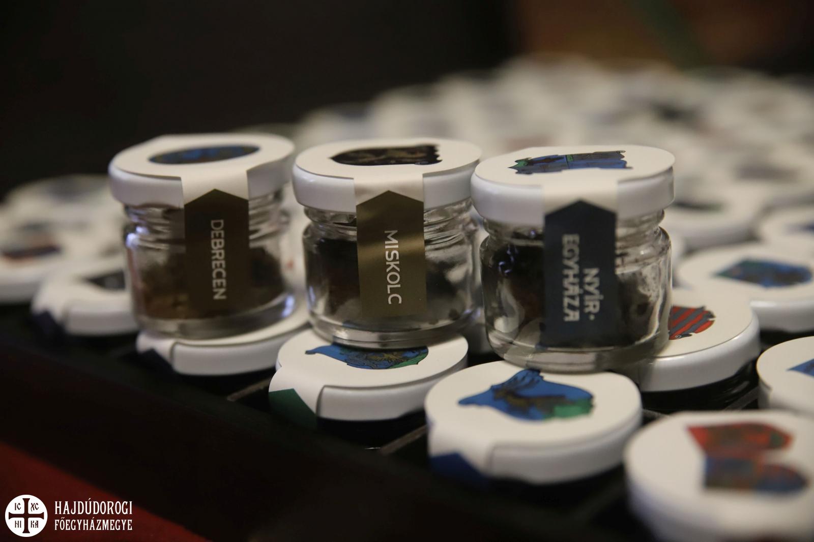 A doboz maga is ízig-vérig magyar, ízléses darab. A Tolna megyei Hőgyészen hársfából készült a tároló, a grafikai munka Lippai András fényeslitkei kötődésű grafikus keze nyomát viseli, az üvegcséket pedig egy Nógrád megyei vállalkozás gyártotta le.
