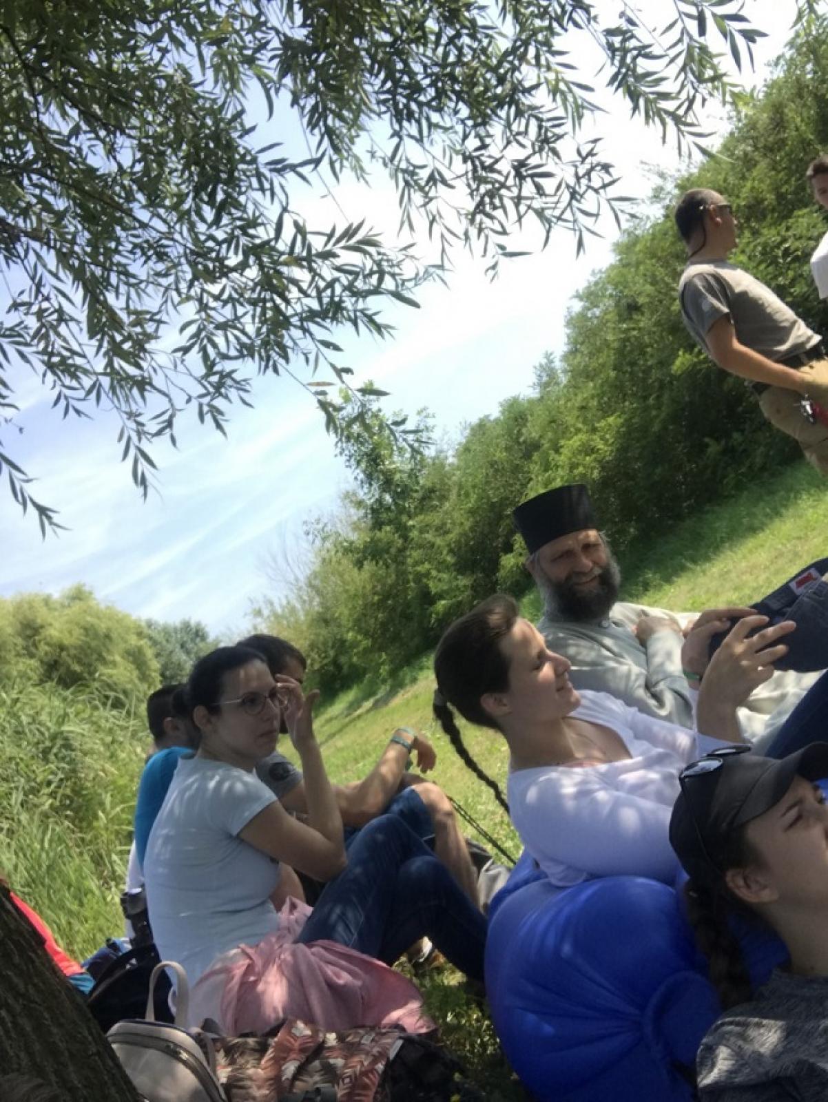 Az első megállóig, egészen a Rakamaz utáni első faluig kellett várni, ahol Fülöp metropolita biztató gondolatai adtak lelki felfrissülést a zarándokoknak. Elmélkedésében arra a pontra irányította a jelenlévők figyelmét, ahol a szőlővessző találkozik a szőlőtőkével, azaz, ahol csatlakozik Krisztushoz a mi életünk. Ahogyan a szőlővessző veszi a táplálékot és energiát a tőkéről, úgy vesszük mi magunk az erőt Krisztustól, mégpedig az imán keresztül. Biztatta továbbá a jelenlevőket, hogy a kemény munkával megszerezhető gyümölcsökre törekedjenek, mert azok az igazi javak.