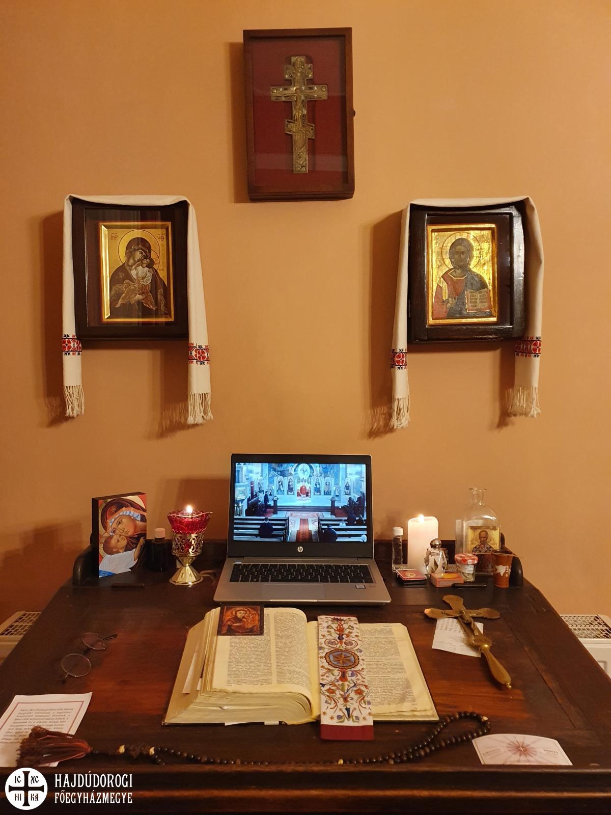 Alapvetően van ebben valami igazságtalanság. Míg az atyák itt állhatnak a templomban, az ikonosztáz előtt, láthatják a gyertyákat, sőt, tömjént is gyújthatnak, a híveknek ott marad a képernyő. No, ez az igazságtalanság nekem is fáj. Azzal lehet kicsit enyhíteni, ha ezúttal nem úgy tekintünk a képernyőre, legyen az tévé vagy számítógép, vagy akár a kis laptop vagy telefon, mint máskor, hanem úgy tesszük ki, mint az imádság egyik fontos eszközét, és mi magunk is így készülünk az imádsághoz.