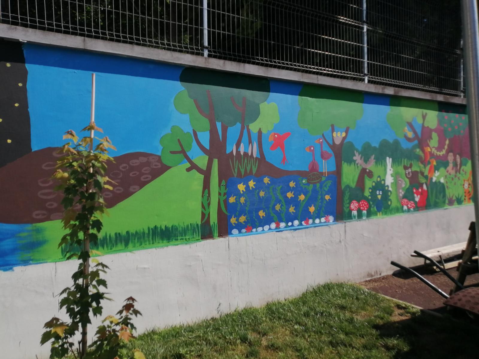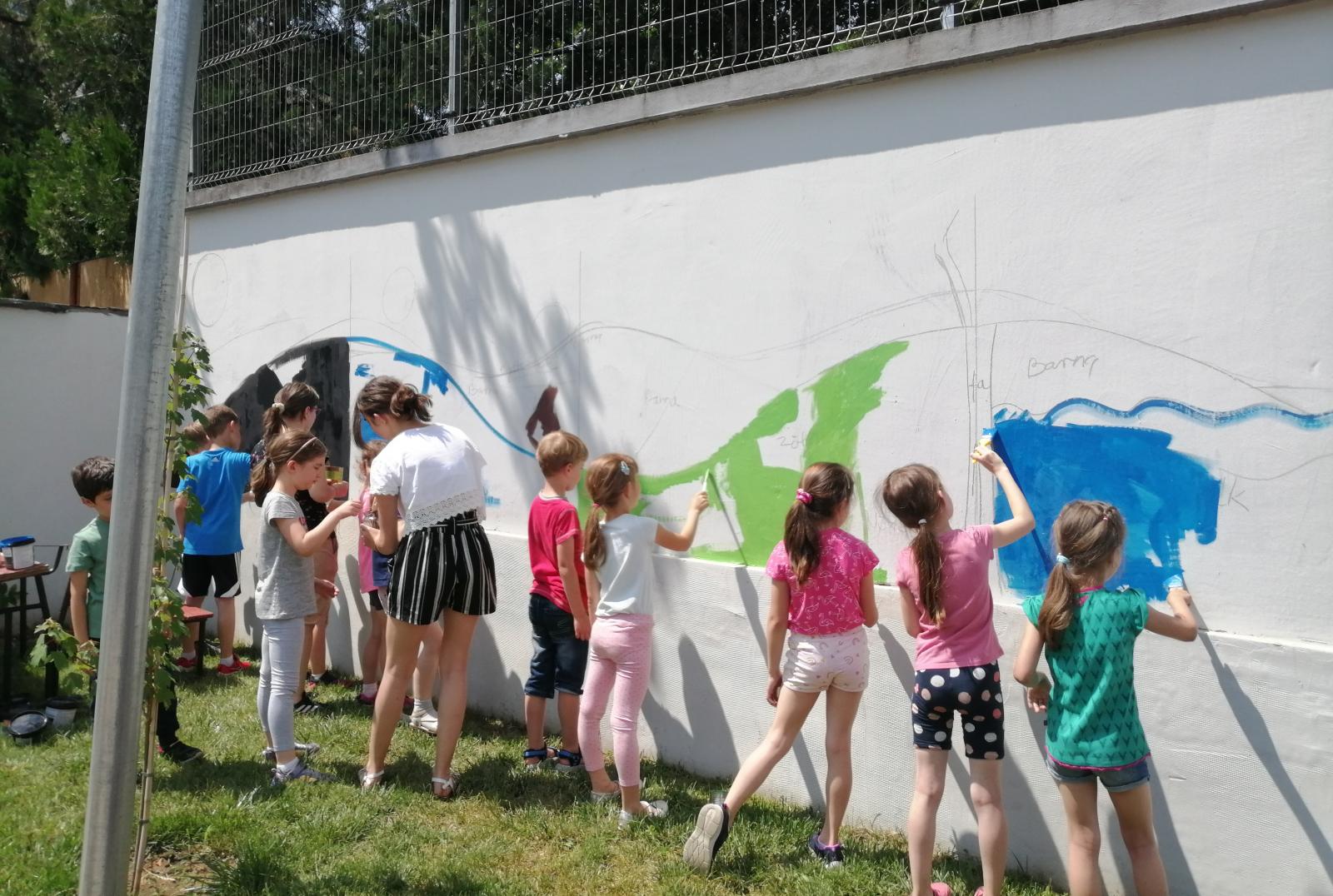 Idén új helyszínt választottunk a terveink megvalósításához, hiszen a Szent Efrém Általános Iskola udvarán rengeteg hívogatóan üres falfelület várt ránk. Célunk az volt, hogy, ilyen módon is barátságossá, vidámmá tegyük környezetünket a színes, esztétikus, tanító jellegű falfestményeink által.