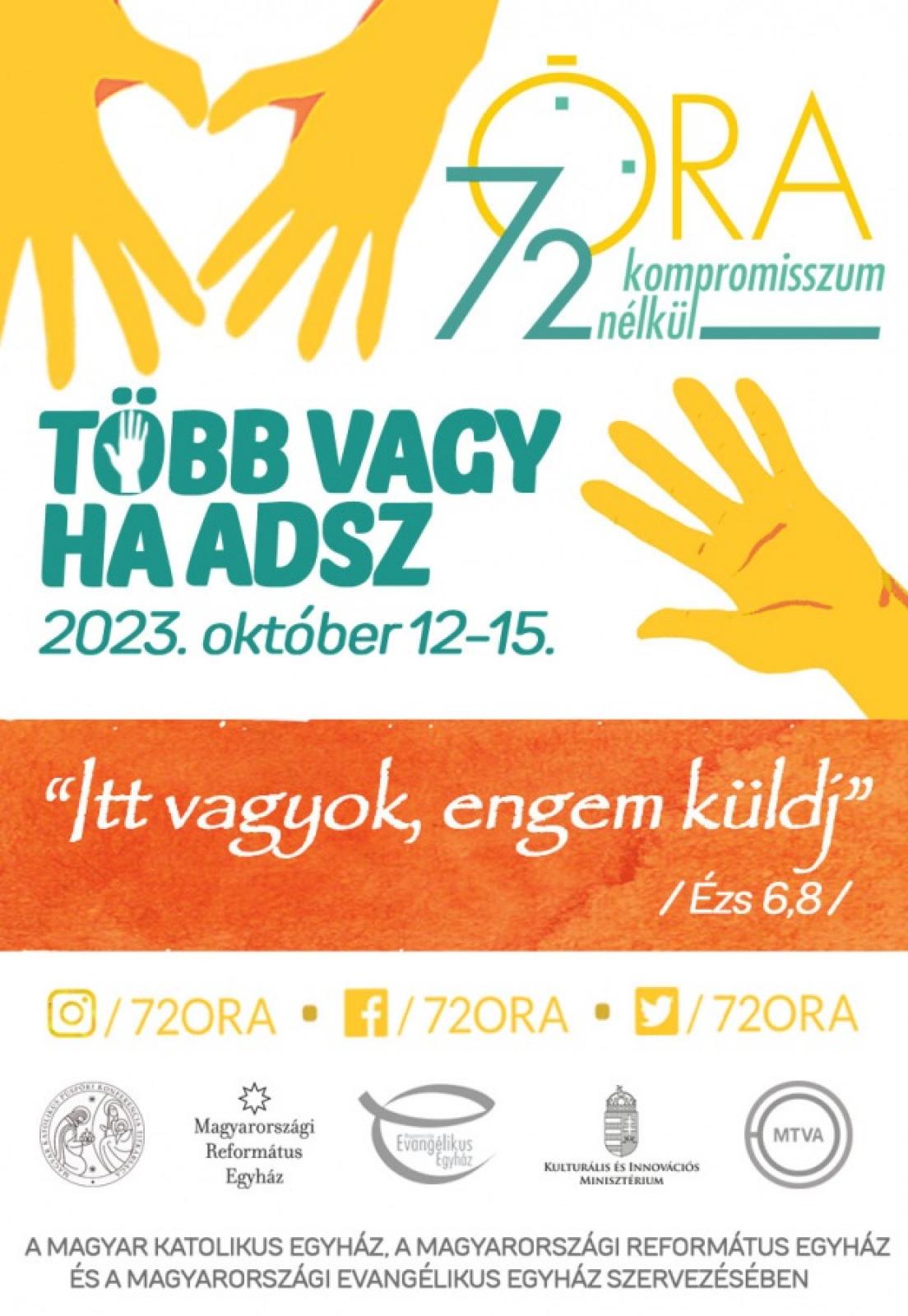A 72 óra kompromisszum nélkül egy szociális önkéntes akció, amelyet a három történelmi keresztény egyház szervez. Az akció Magyarország fiatalságát hívja közös összefogásra, hogy együtt tegyünk másokért, környezetünkért. Országszerte fiatalok kisebb-nagyobb csoportjai három napon, azaz 72 órán keresztül teljesítenek közhasznú feladatokat: intézmények, játszóterek felújítása, erdőtakarítás, szociális segítségnyújtás, kulturális műsorok szervezése különböző közösségeknek (fogyatékkal élők, idősek stb.). Úgy is mondhatnánk: exkluzív kalandtúra a Magyar Katolikus Egyház, a Magyarországi Református Egyház és a Magyarországi Evangélikus Egyház szervezésében. A 72 óra célja az, hogy a fiatalokat, elsősorban a középiskolás és az egyetemista korosztályt meghívja, hogy ezen a hétvégén tegyék szabaddá magukat arra, hogy segítsenek ott, ahol szükség van rá.