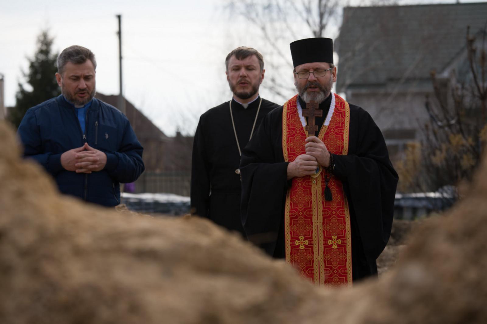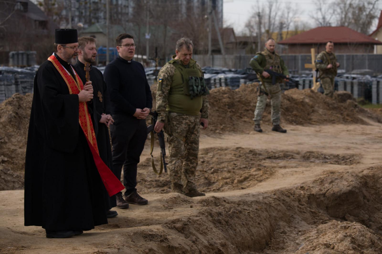 „Bármelyikünk itt lehetne ebben a tömegsírban – mondta. – Az Úristen adjon nyugodalmat ártatlanul meggyilkolt szolgái lelkének, mentse meg az emberi életeket, óvja meg Ukrajnát a gonosztevőktől, akik gyilkolni, fosztogatni és rombolni jöttek ide. A meggyilkolt ártatlanok emléke örökké velünk marad.”