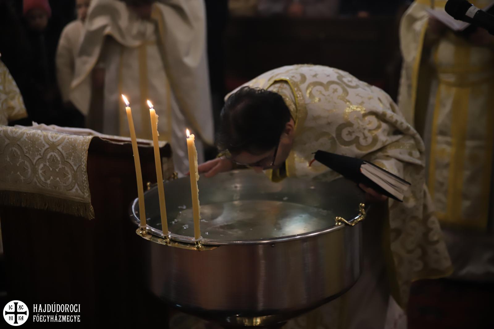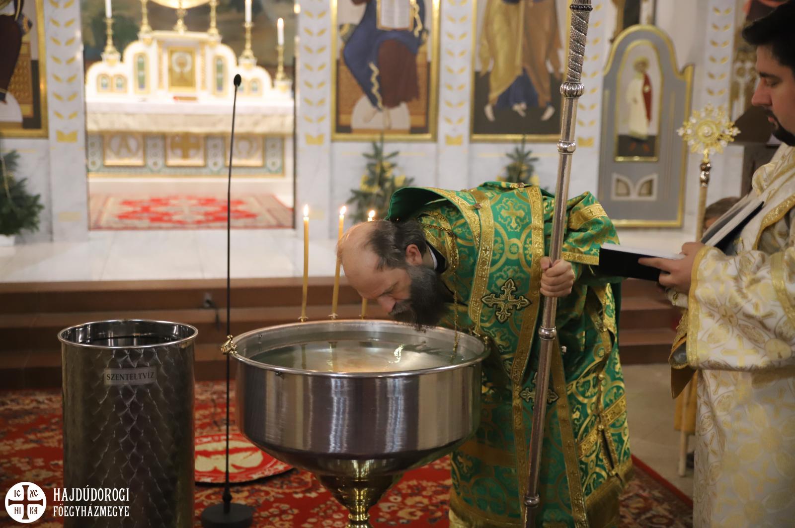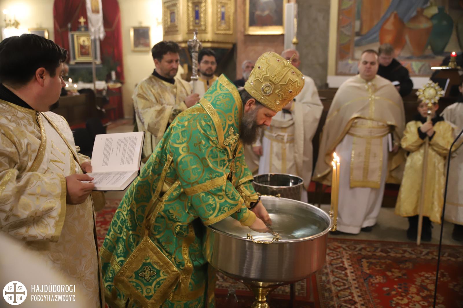 A bizánci egyház hagyományai szerint már a vízkereszt előestéjén végzett alkonyati istentiszteleten is végeznek vízszentelést. Ehhez Kocsis Fülöp érsek atya elsőként levette a mandiászt vagyis püspöki palástot és magára öltötte a vízszentelés idején használatos zöldszínű öltözetet.