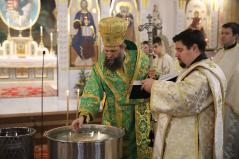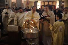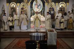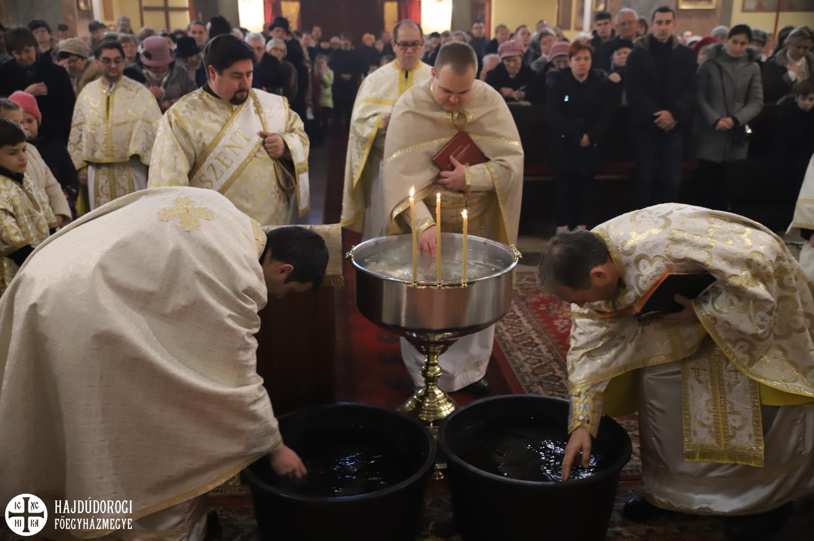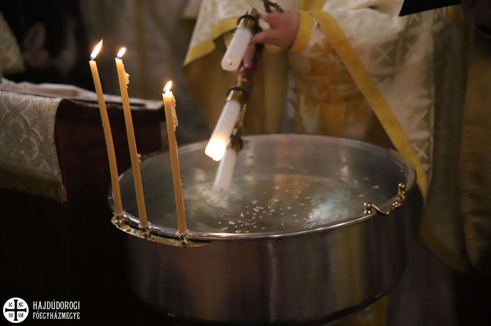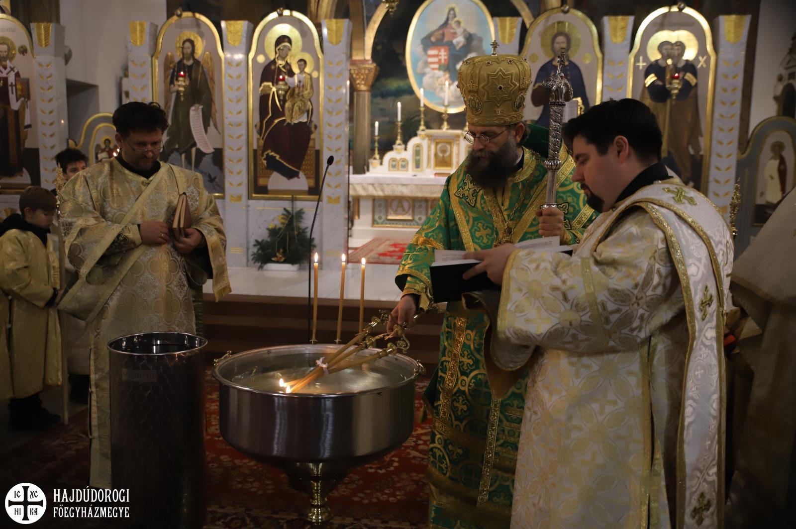 A bizánci egyház hagyományai szerint már a vízkereszt előestéjén végzett alkonyati istentiszteleten is végeznek vízszentelést. Ehhez Kocsis Fülöp érsek atya elsőként levette a mandiászt vagyis püspöki palástot és magára öltötte a vízszentelés idején használatos zöldszínű öltözetet.