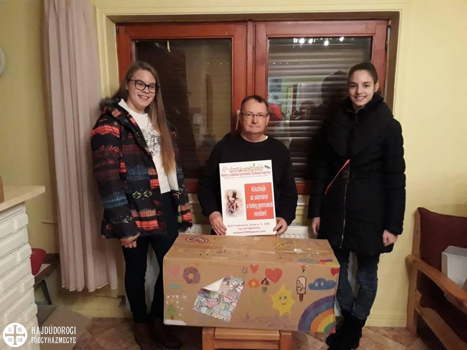A nyíradonyi Szent Mihály Görögkatolikus Óvoda és Általános Iskola is részt vett a „Remény a Leukémiás Gyerekekért Alapítvány” által szervezett nagyszabású csokoládégyűjtési akcióban, melynek célja az volt, hogy egy tábla csokival tegyük szebbé a beteg gyerekek napjait a karácsonyi ünnepek alatt. Diákjaink nagyon sok csokoládét gyűjtöttek, melyeket kedves üzenetekkel láttak el. Így intézményünk egy nagy doboznyi szeretetet küldött a legszebb ünnepre a beteg gyerekeknek. A csokoládékkal megtömött dobozt Verdes Ágnes és Vámosi Viktória, iskolánk tanulói adták át az alapítvány debreceni székhelyén.