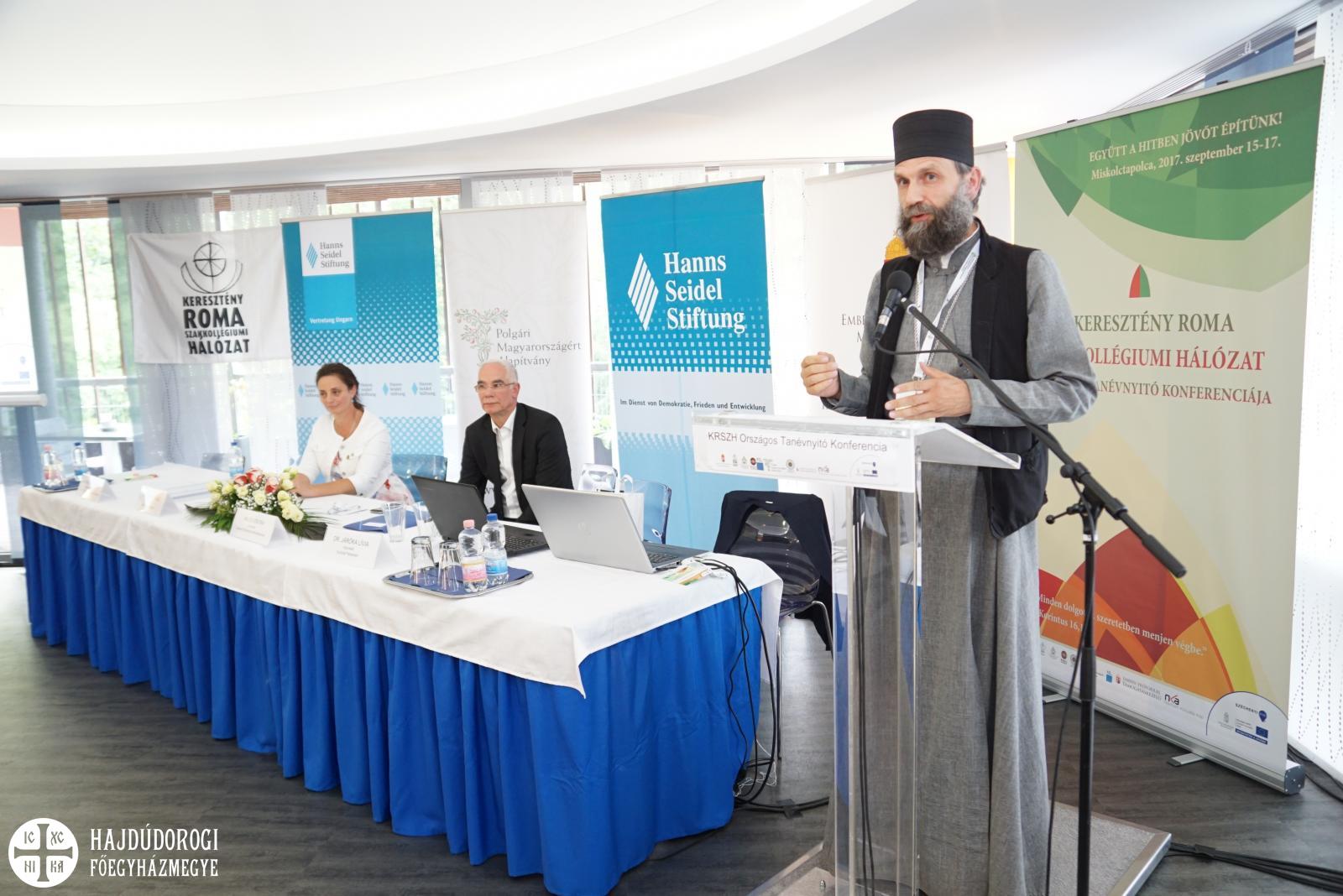 A Keresztény Roma Szakkollégiumi Hálózat országos tanévnyitó konferenciája szombaton délelőtt folytatódott. Indulni csak az tud, aki hisz, és reméli is, hogy célba ér. Hisz abban, hogy van értelme életének, tanulmányainak és hisz Istenben is, lelkesítette a hallgatókat Orosz Atanáz, miskolci püspök tanévnyitó beszédében. A keresztény ember egészséges önbizalma mellett, Isten kegyelmére épít. „A keresztény roma szakkollégiumok hálózata az Istenre építők szövetsége”, mondta a főpásztor, majd Nagy Szent Bazil tanítására hívta fel a hallgatóság figyelemét: a "szeretet által tevékenykedő hit" kereszténységünk és közösségeink alapja, irányadója.