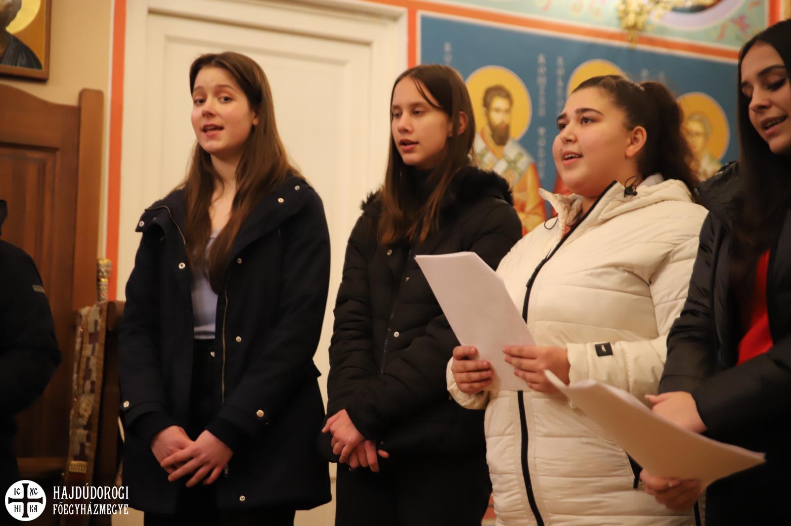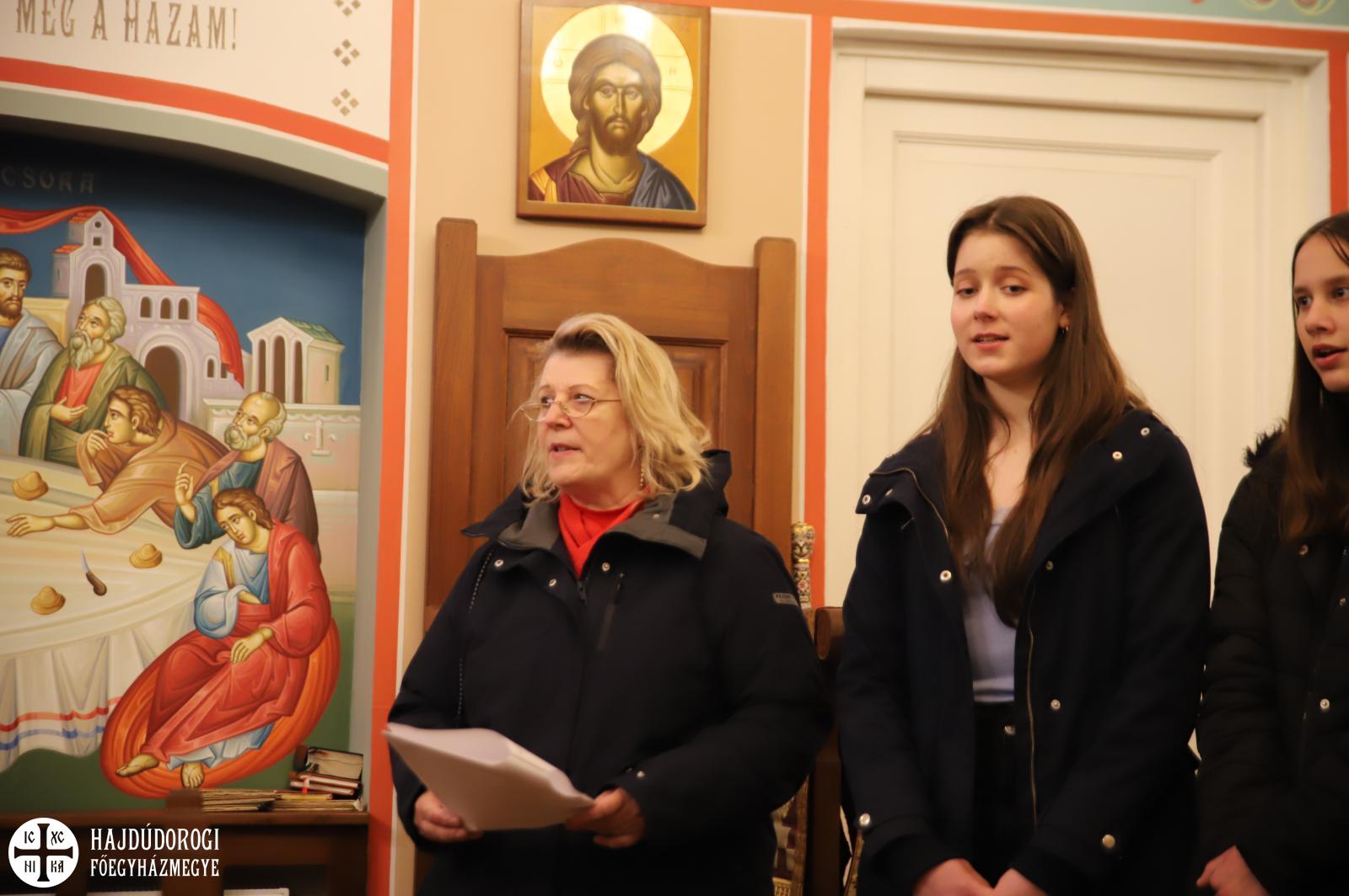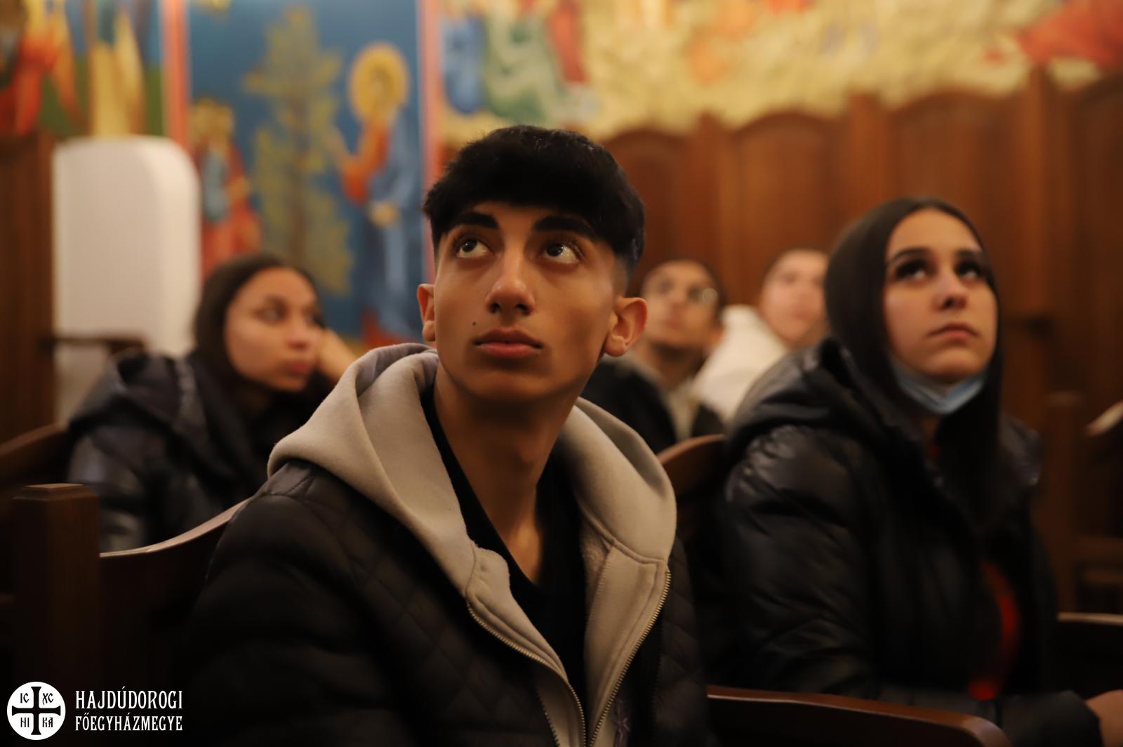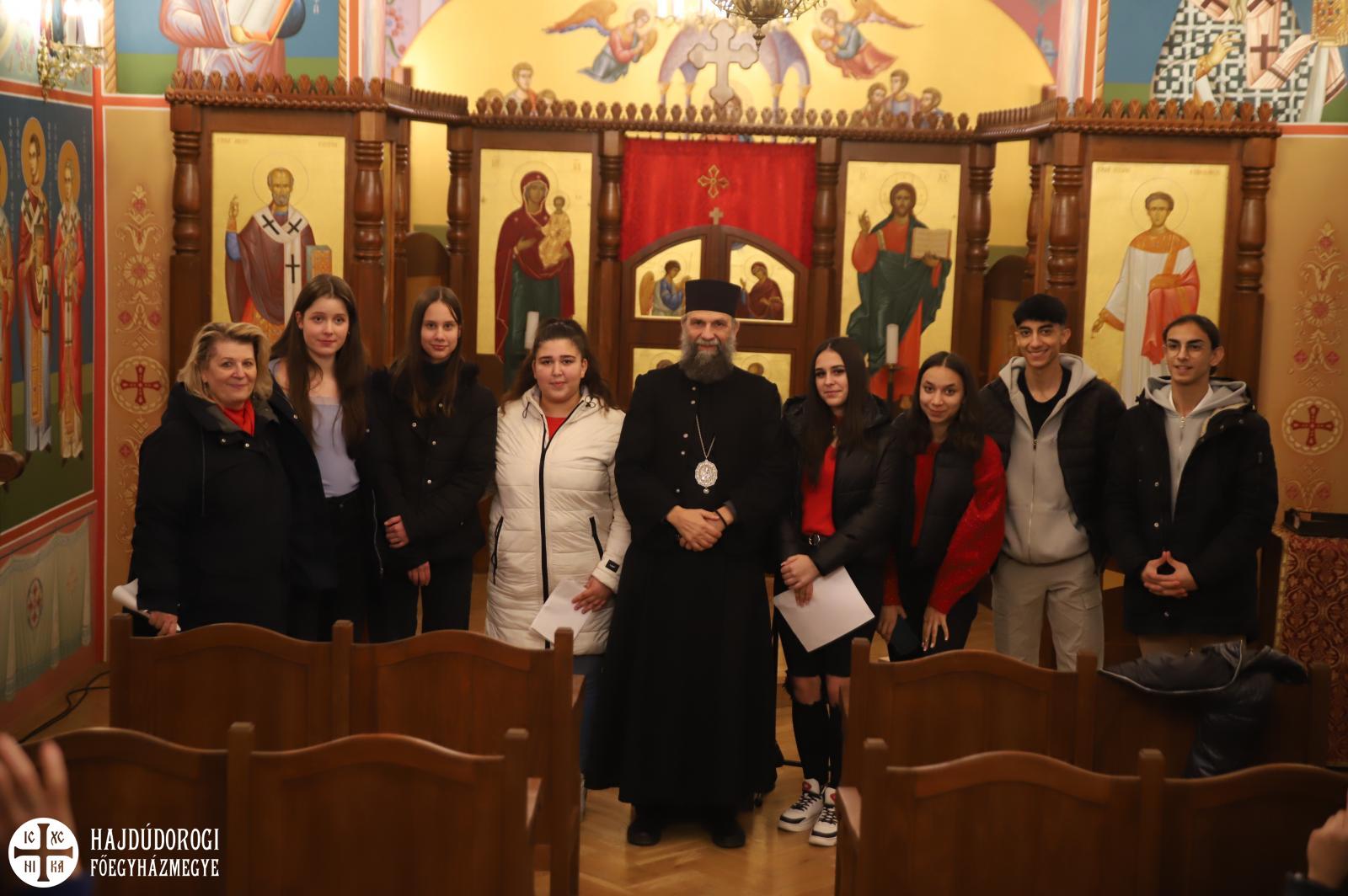 A kórházi műsor után az Érseki Hivatal dolgozóinak is kedveskedtek egy rövid kántálással, előtte lelkesen hallgatták Kocsis Fülöp metropolita atyát, aki az ikonok világába vezetette be a fiatalokat.