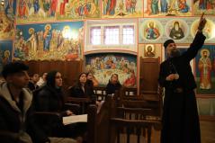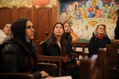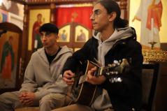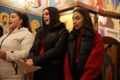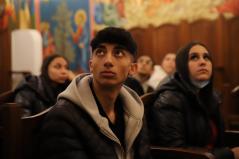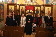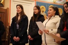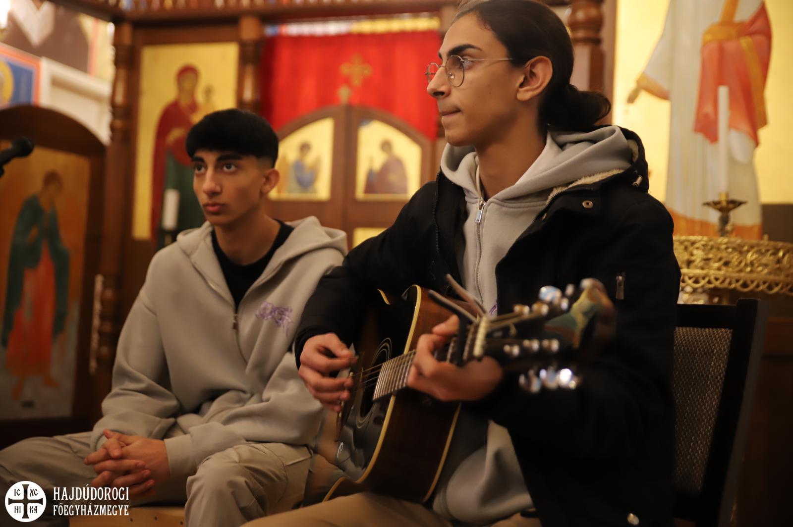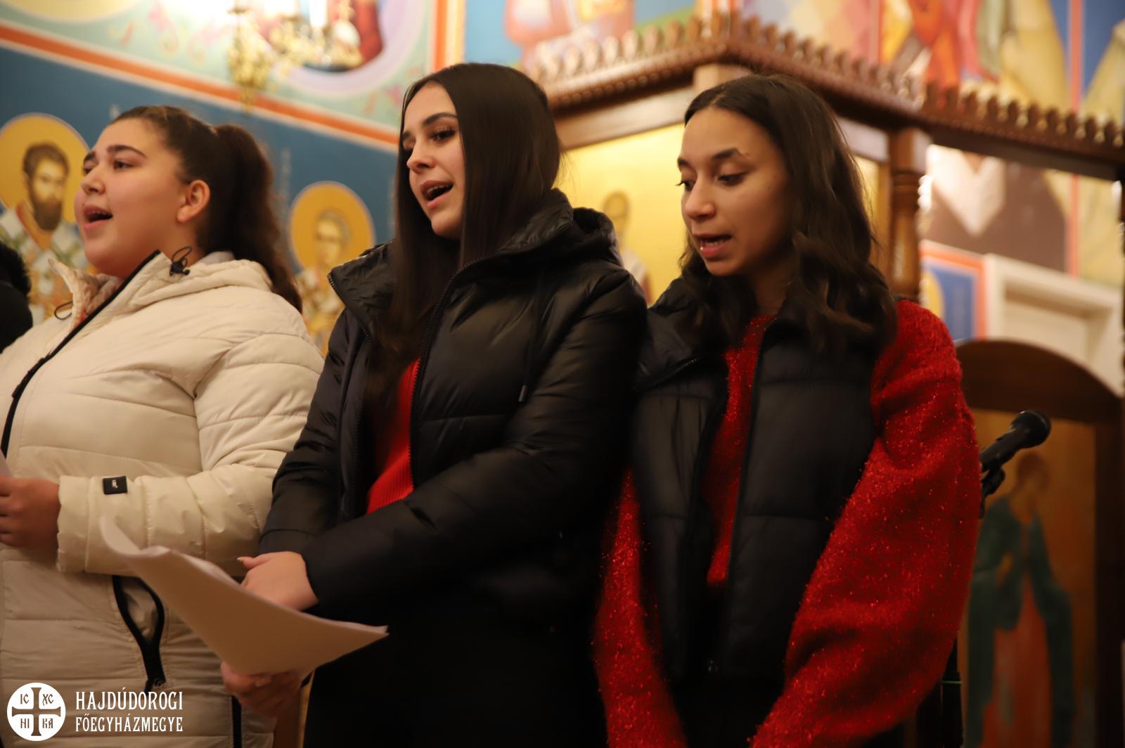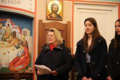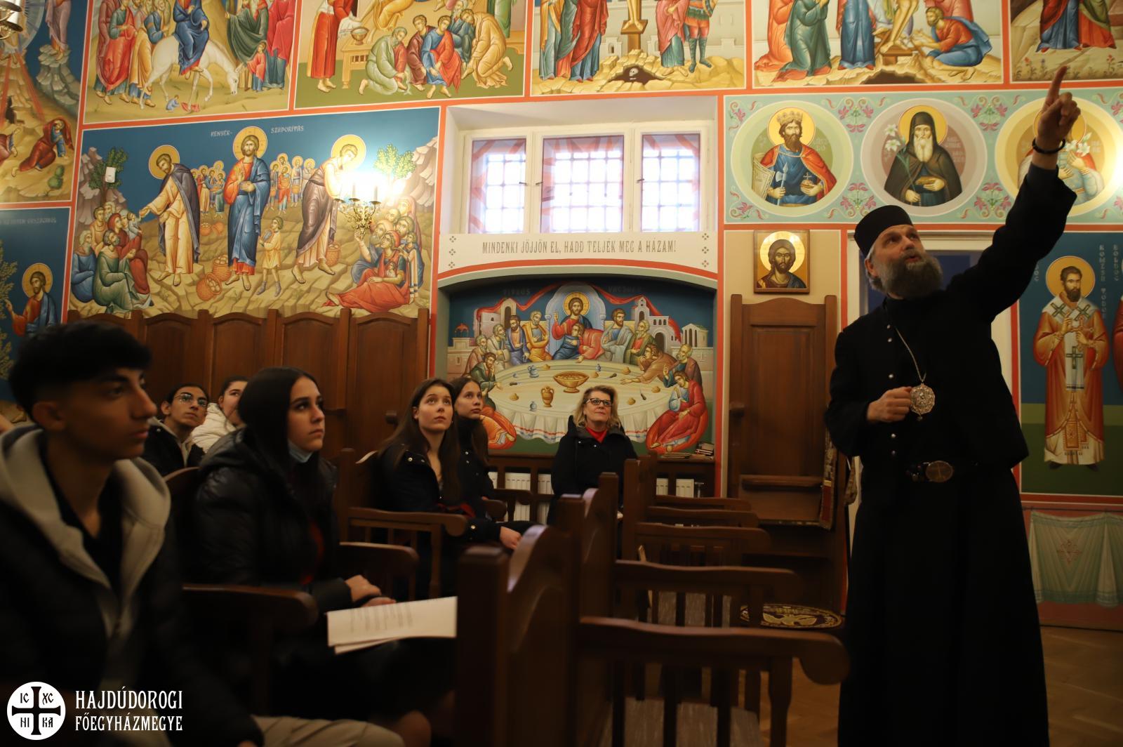 A kórházi műsor után az Érseki Hivatal dolgozóinak is kedveskedtek egy rövid kántálással, előtte lelkesen hallgatták Kocsis Fülöp metropolita atyát, aki az ikonok világába vezetette be a fiatalokat.