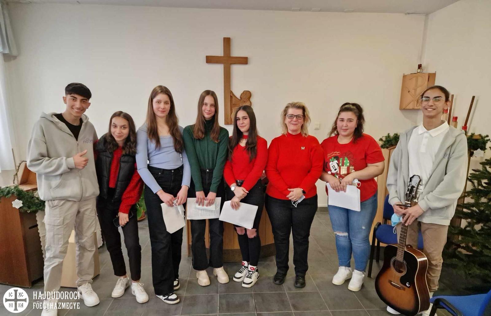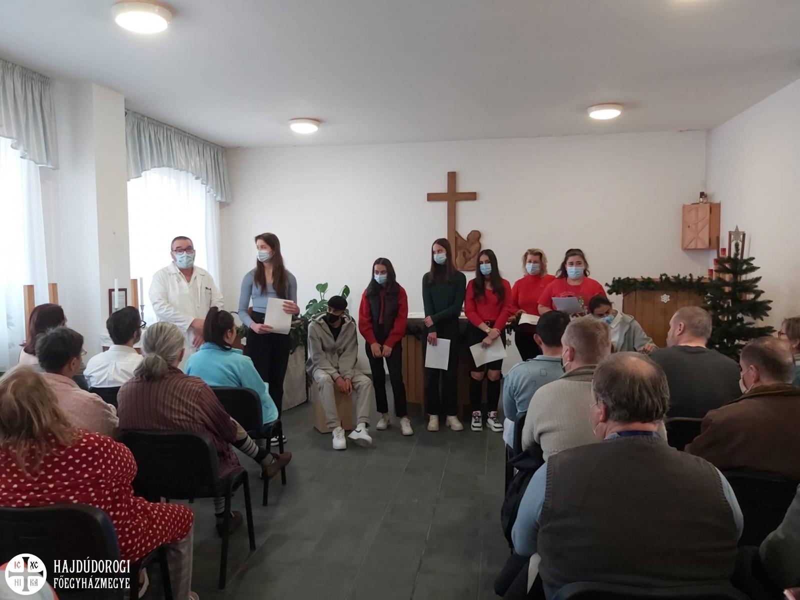 Hagyományt teremtve, december 18-án délelőtt újra meglátogatták a Szent László Görögkatolikus Gimnázium és Technikum 10. E osztályos tanulói - felkészítő és kísérő tanárukkal, Laczkóné Király Emesével - a Debreceni Egyetem Kenézy Gyula Campus Felnőtt Pszichiátriai Osztályát, és karácsonyi műsorukkal szereztek mérhetetlen örömöt a betegeknek és az ott dolgozóknak. Gitárral és dobbal kísért énekeik mellett ünnepi versek is elhangzottak. A fiatalok emelkedett lelki állapotban tértek vissza iskolájukba, hiszen ők is sok szeretetet kaptak a hálás betegektől. Mindnyájan egyetértenek abban, hogy mennyire fontos az idősek és a fiatalok, a betegek és leendő ápolóik találkozása, a kórház légkörének a megismerése és az örömszerzés, hiszen egészségügyi pályára készülnek, és gyakorlati felkészülésüket is a kórházban fogják tölteni.