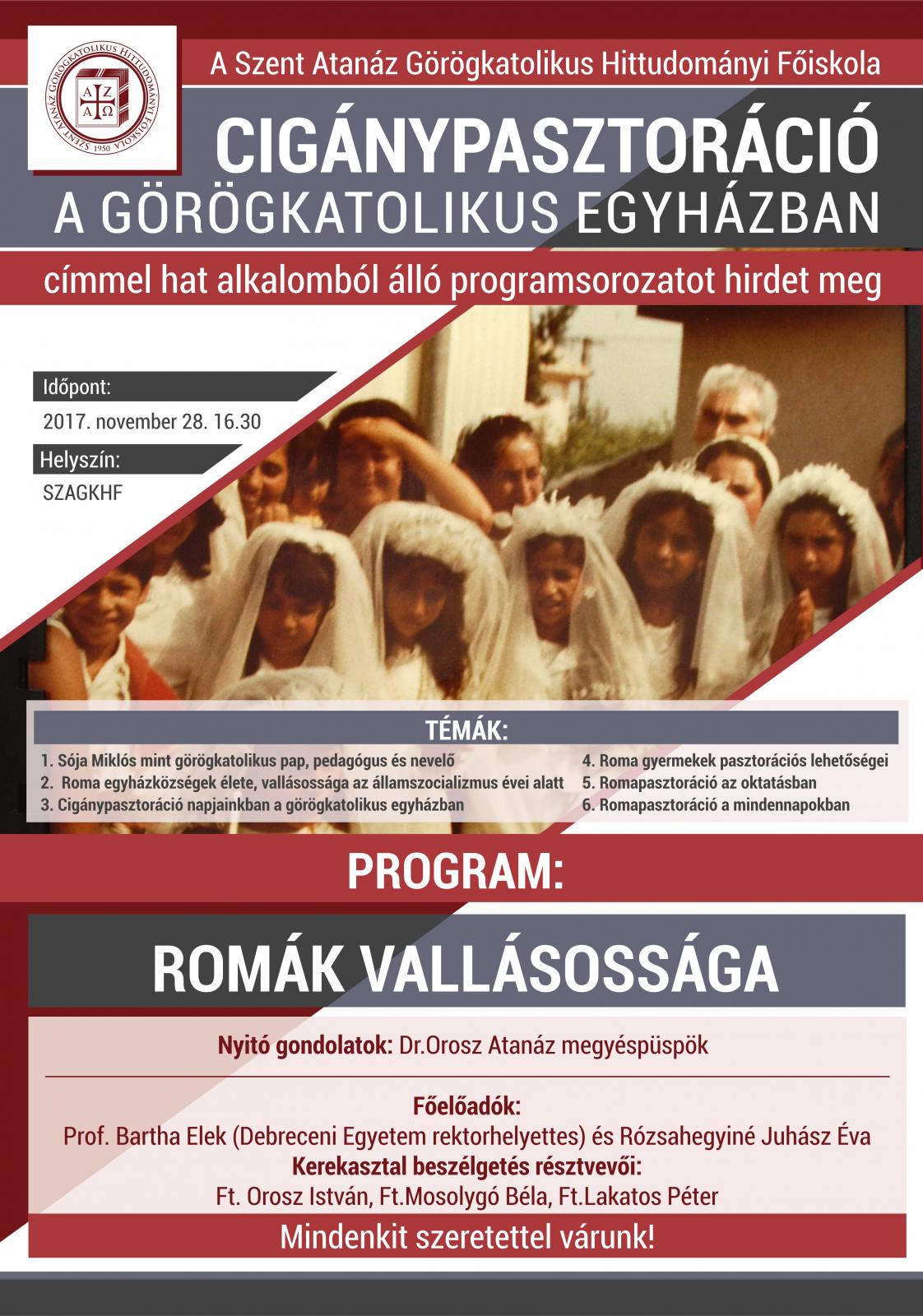 A Szent Atanáz Görögkatolikus Hittudományi Főiskola Cigánypasztoráció a Görögkatolikus Egyházban címmel szervez programsorozatot. A következő alkalom 2017. november 28-án lesz. Részletek a plakáton.