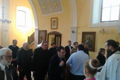 Egy kellemes hangulatban töltött ebéd után a Szatmárnémeti Szent Miklós görögkatolikus templom következett. Itt id. Pallai Béla parókus, c. esperes mesélt az egyházközségről, templomról, annak nagy múltú gyökereiről és jelenéről. Innen Kaplonyba mentek, ahol a ferences kolostor mellett a Károlyi család kriptáját is megtekintették. Végül a nagykárolyi Szent Mihály és Gábor arkangyalok görögkatolikus templomban együtt imádkozták el a Parakliszt a károlyi görögkatolikus hívekkel. Ezt követően Vadas Krisztián parókus atya ismertette a HU/RO, határon átívelő projekt keretében megújult, nagykárolyi magyar ajkú görögkatolikus egyházközség templomának történetét.