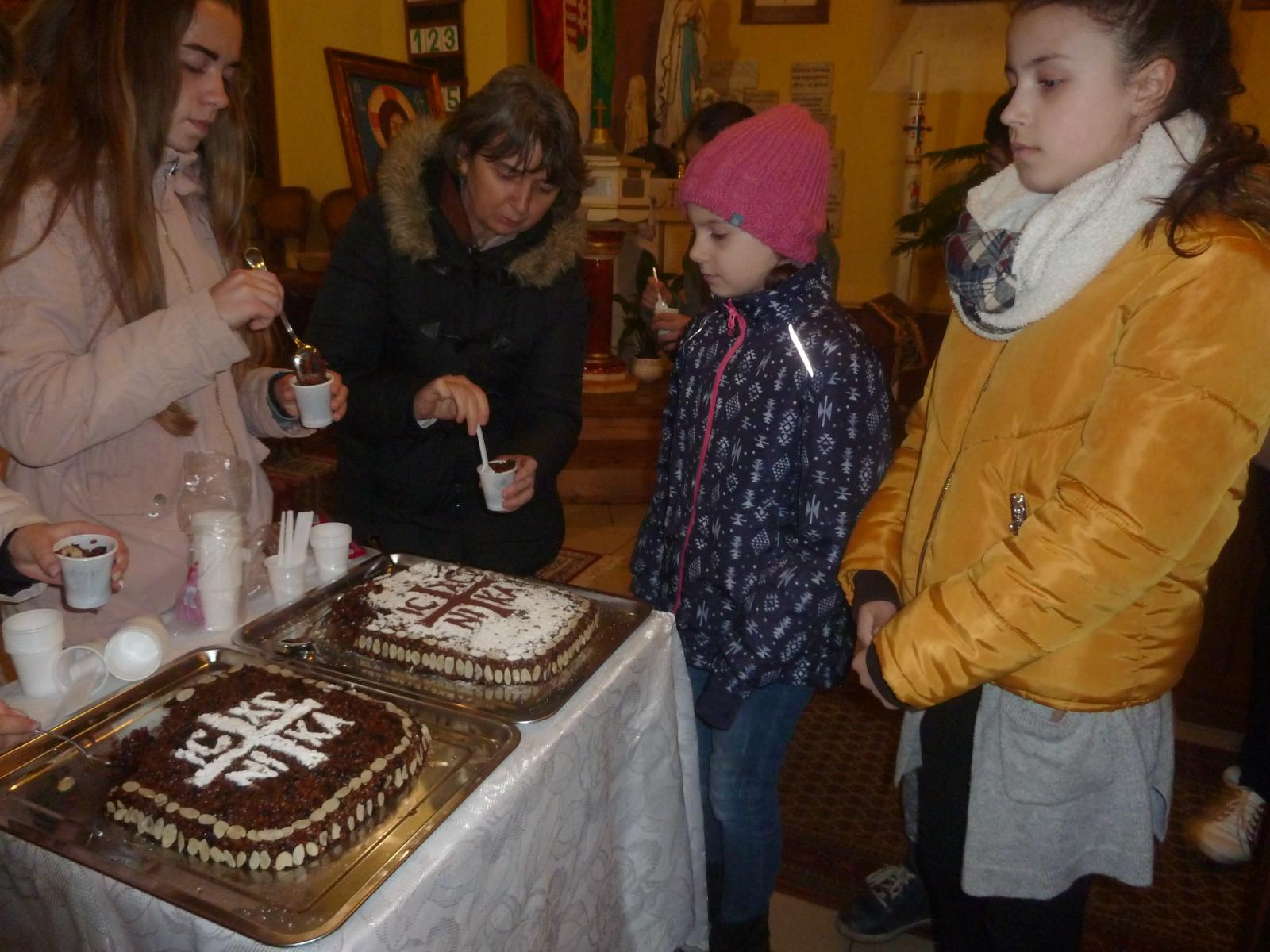 A különleges alkalmat nagy lelkesedéssel várták már a templomban a kis hittanos gyerekek is, akik egymást túlharsogva gyakorolták a nagyböjti liturgikus énekeinket a szertartásra készülve. Tisztelendőasszony kezében meglátva a már-már műalkotásoknak is beillő finomságokat a kicsik rögtön arról érdeklődtek, hogy mikor kaphatnak a gyönyörű „tortából”.