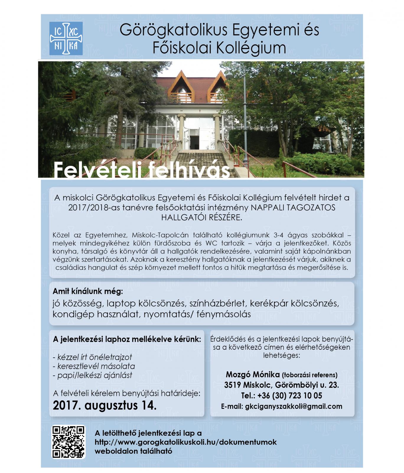A felvételi kérelem benyújtási határideje: 2017. augusztus 14.