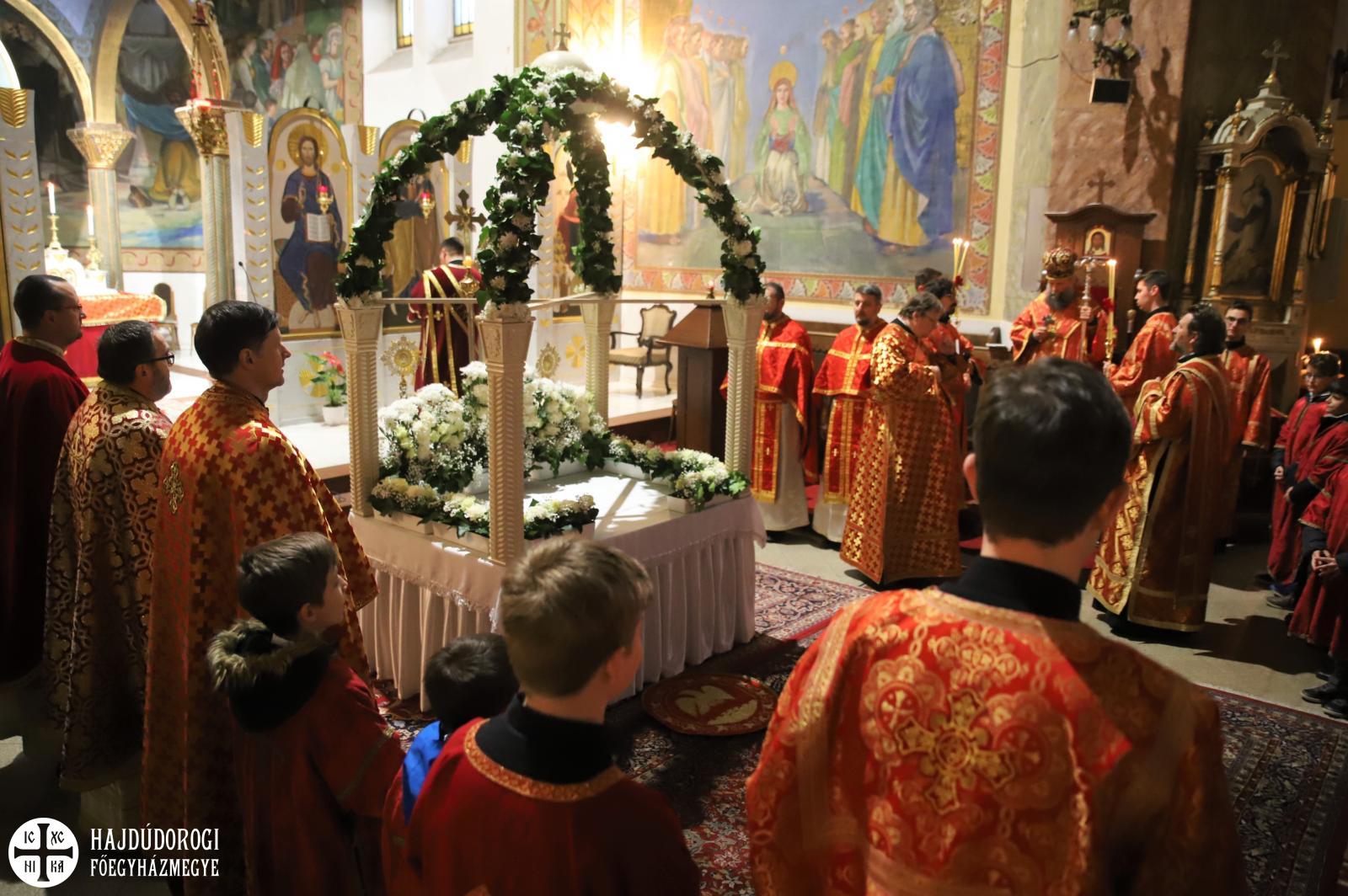 A vecsernye legszebb pillanatai voltak azok, amikor Fülöp érsek-metropolita atya háromszor megtömjénezte az oltárra terített, Krisztus testét ábrázoló sírlepelt, amit aztán a magasba emelve vittek körbe a főszékesegyház körül. A körmenet közben fennhangon énekelték a hívek a tropárt: "Az istenfélő József levevén a fáról a te legtisztább testedet, tiszta gyolcsba göngyölé és illatos szerekkel ellátva új sírba helyezé." Majd a sírlepel alatt fejet hajtva léphettek be ismét a templomba. A szertartás végén a virágokkal díszített szentsíron elhelyezték a liturgikus kendőt, amit csókkal illethettek a hívek is.