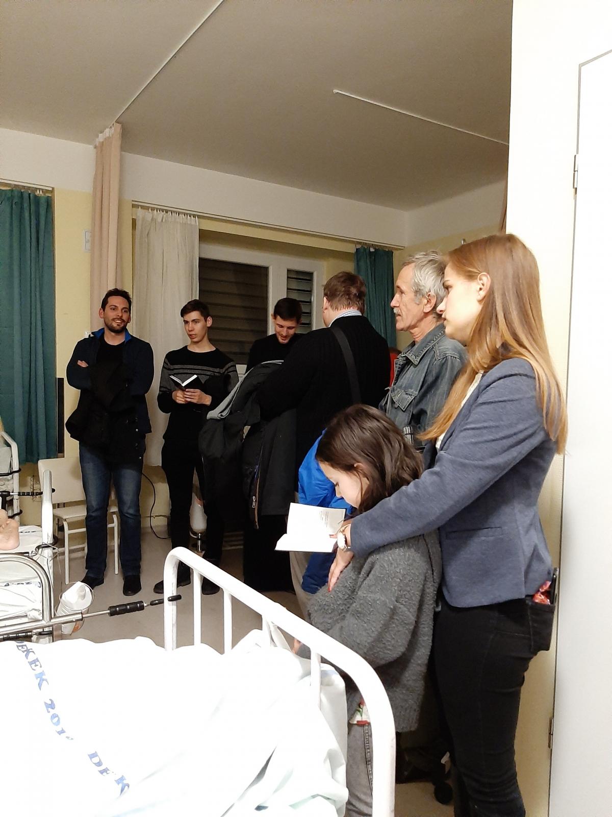 Sokszor éreztem azt, hogy vajon erre van e szükségük, nem zavarjuk-e őket. De hamar elillant ez a gondolat, amikor a mosolygó arcokat, erőtlenül, de éneklő ajkakat láttam. Nem beszélve arról, hogy amikor az osztályt éppen elhagyni készültünk az egyik szoba énekelve búcsúztatott minket. Krisztus születik!