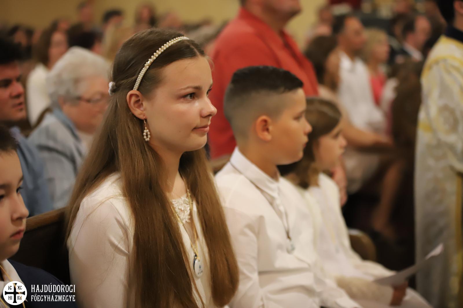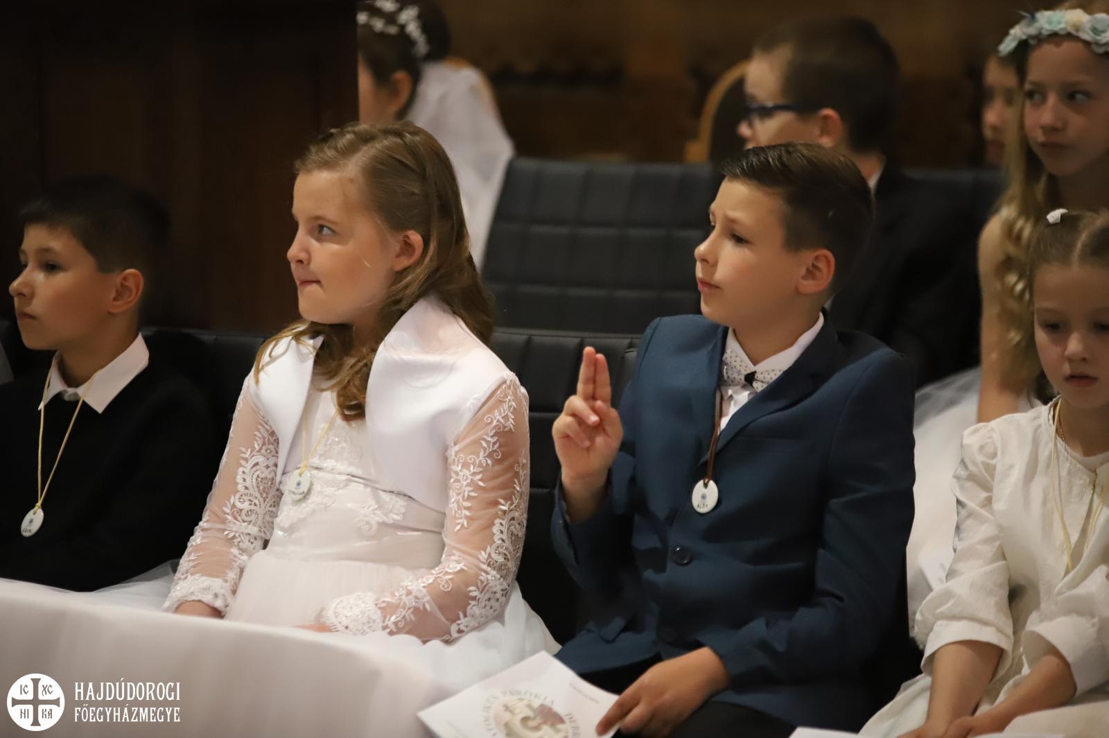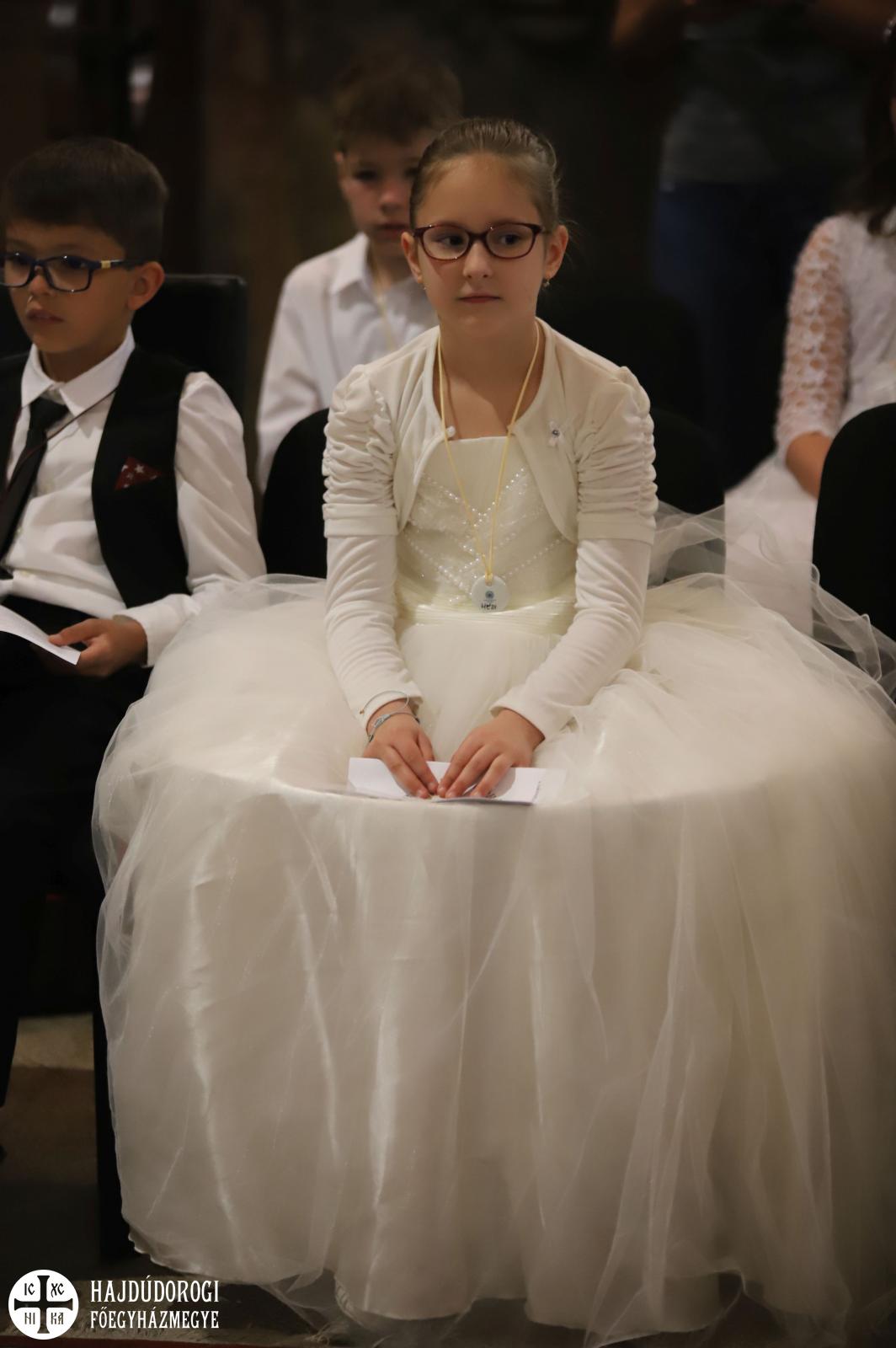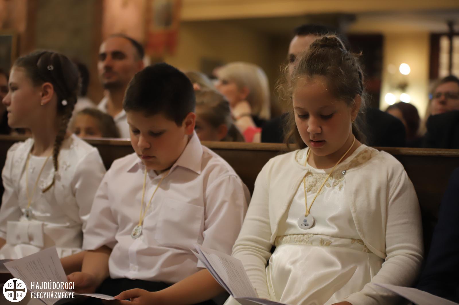 – Mindnyájan vakon születünk, órák, sőt, sokszor napok telnek el, mire elkezdünk fényeket, foltokat észlelni. Úgy, ahogyan a kezdetekben még csak foltokat, majd alakokat látunk, a lelki látásunk is fokozatosan lesz egyre erősebb, tisztább. Csak az utóbbihoz sokkal több idő szükséges. Hosszú évek kellenek ahhoz, hogy megismerjük Jézust. Most, amikor itt vagytok az elsőáldozáson: vajon többet tudtok-e a Mindenhatóról? – szólt a kicsikhez a főpásztor, majd rögvest válaszolt is: „Remélem!”