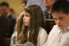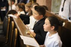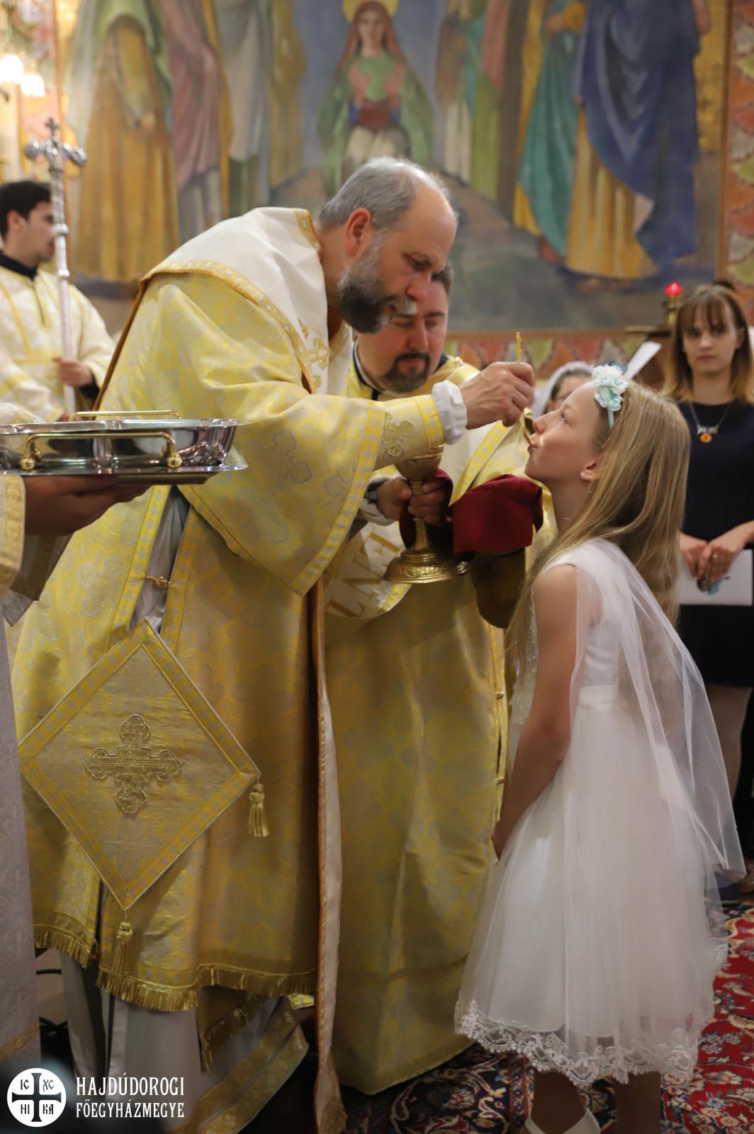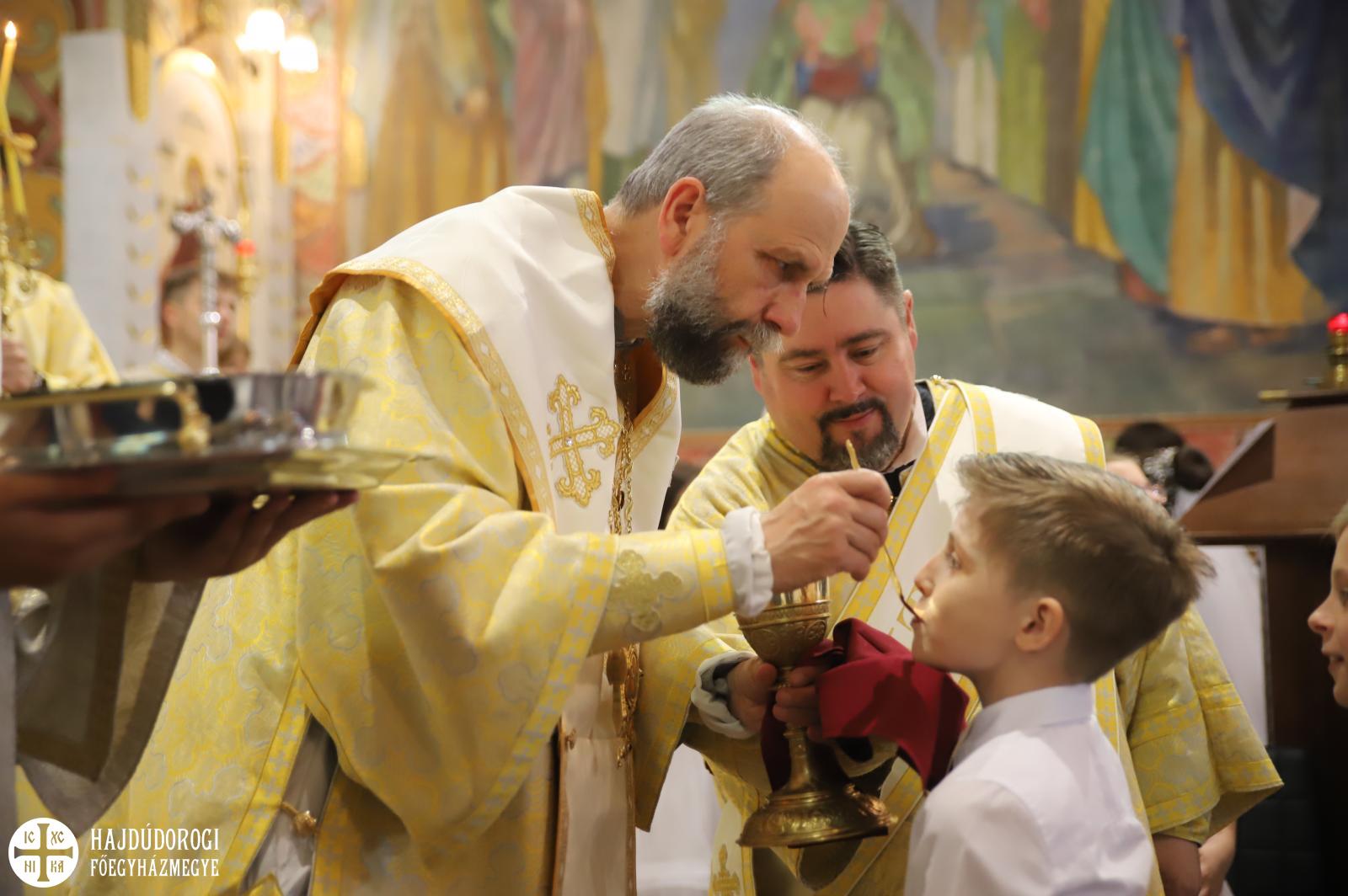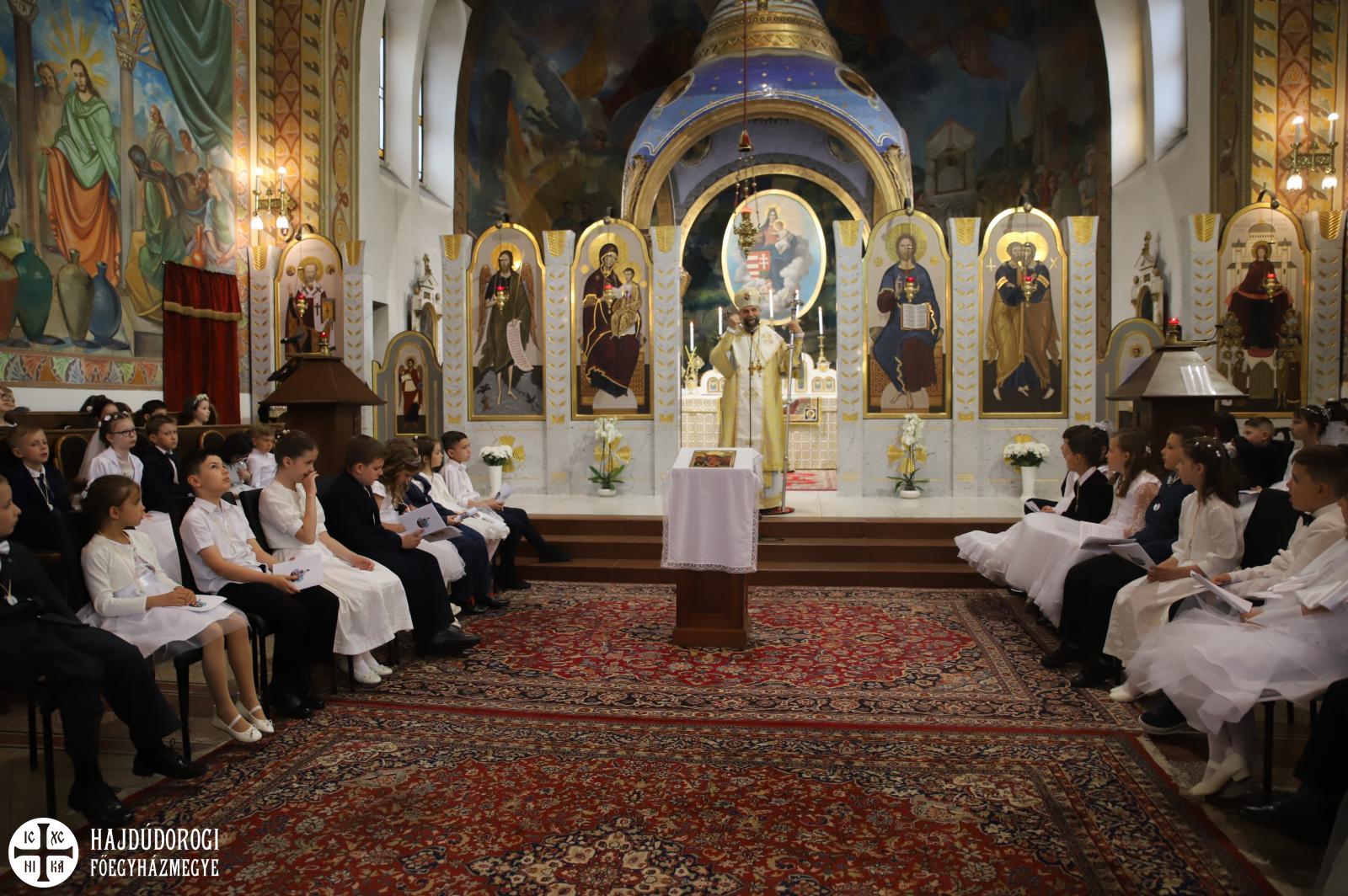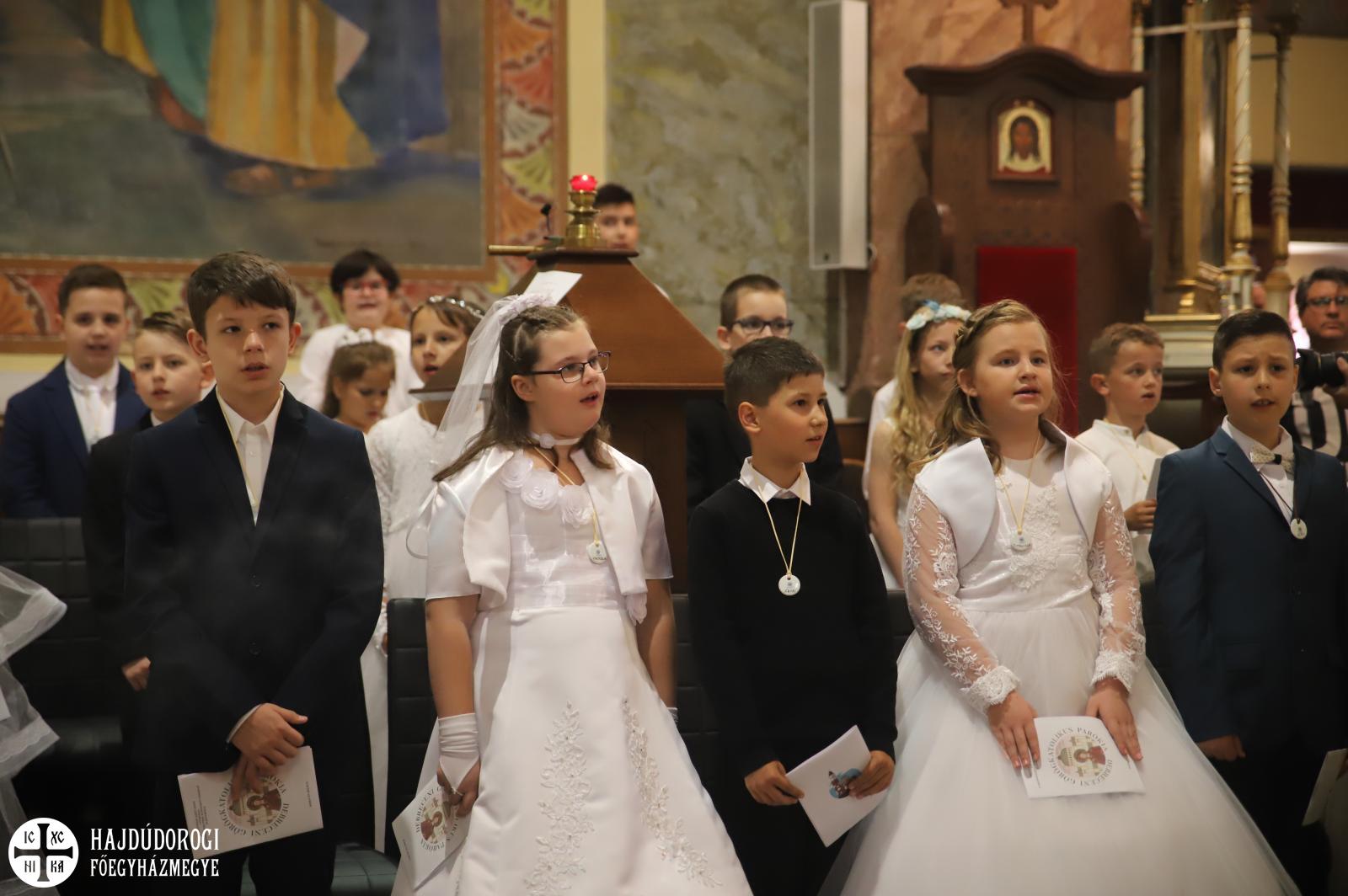 – Mindnyájan vakon születünk, órák, sőt, sokszor napok telnek el, mire elkezdünk fényeket, foltokat észlelni. Úgy, ahogyan a kezdetekben még csak foltokat, majd alakokat látunk, a lelki látásunk is fokozatosan lesz egyre erősebb, tisztább. Csak az utóbbihoz sokkal több idő szükséges. Hosszú évek kellenek ahhoz, hogy megismerjük Jézust. Most, amikor itt vagytok az elsőáldozáson: vajon többet tudtok-e a Mindenhatóról? – szólt a kicsikhez a főpásztor, majd rögvest válaszolt is: „Remélem!”