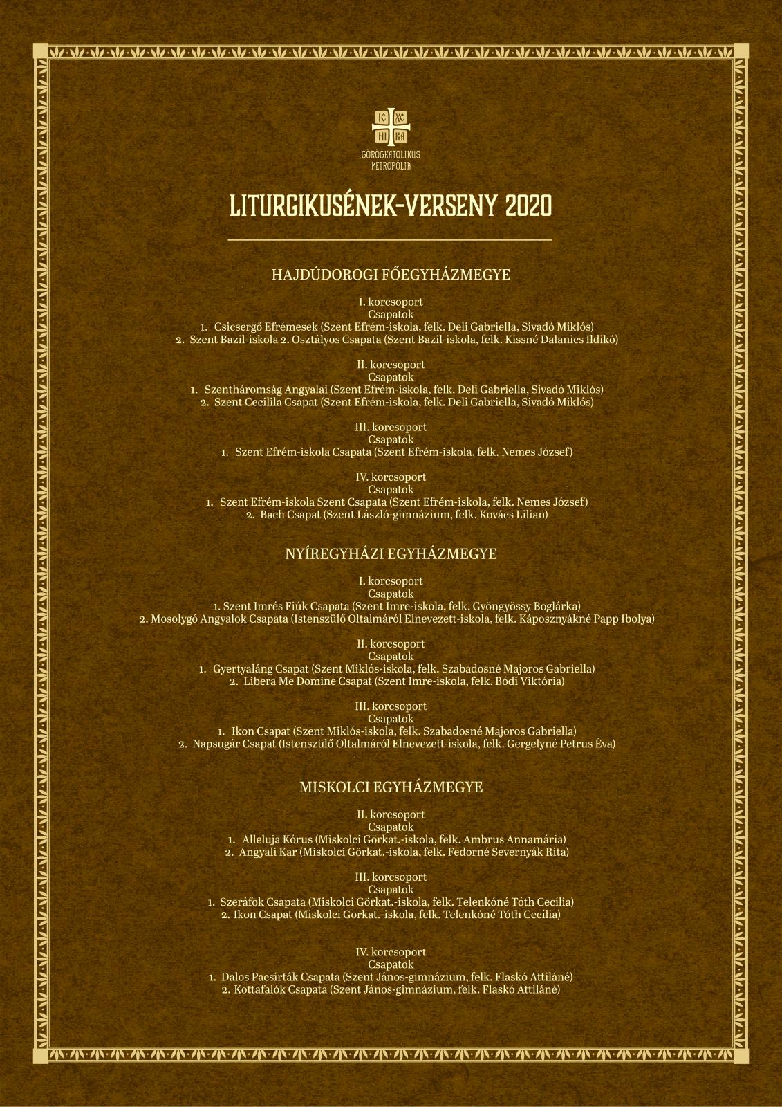 Itt közöljük azoknak a nevét, akik bejutottak az országos döntőbe, s akiktől most elektronikus úton várjuk az éneküket. Bármilyen felvételre alkalmas készülékkel el lehet készíteni a fölvételt. Nem a technika, hanem az ének minősége számít. S nem csak az ének biztos ismerete, tiszta végigéneklése, hanem annak módja is. Hiszen liturgikus énekünkkel a legtöbbször másokat is megénekeltetünk, megimádkoztatunk, ezért nem mindegy, hogyan adjuk elő a megfelelő éneket. Erre is figyelni kell tehát.