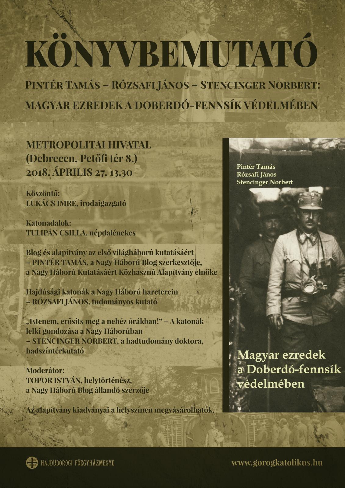 A debreceni könyvbemutatón Lukács Imre atya a főegyházmegye érseki hivatalának irodavezetője mond köszöntőt, majd érdekes előadások hangzanak el, többek között Stencinger Norbert hadszíntérkutatótól is, aki arról beszél hogyan gondozták a katonák lelkét a háború alatt.