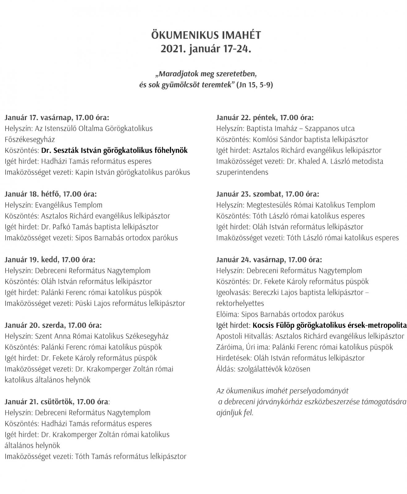 Az ökumenikus imafüzet és vecsernye szövege a "kapcsolódó média" fülre kattintva tölthető le, alább pedig a debreceni programokat közöljük.