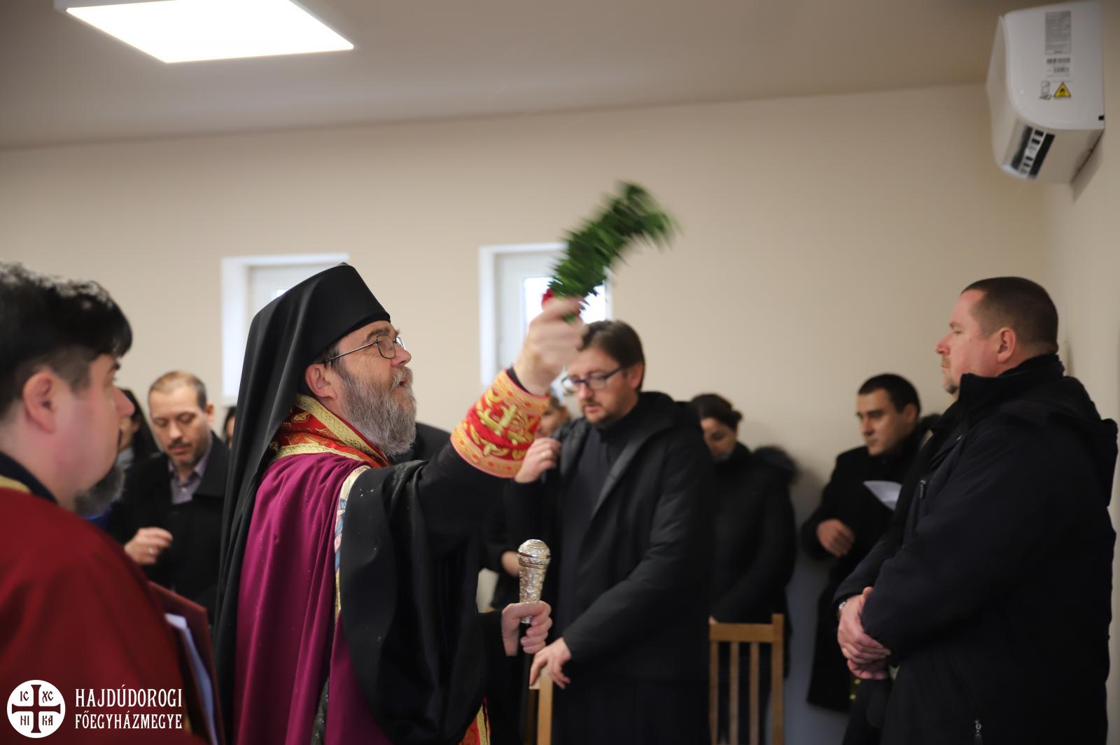 Az épületmegáldás szertartását püspökeink közösen végezték. Atanáz püspök szenteltvízzel hintette meg, Ábel püspök pedig szentelt olajjal kente meg a falakat, jelezvén, hogy az épület ezentúl a Szentháromság oltalma alatt áll.