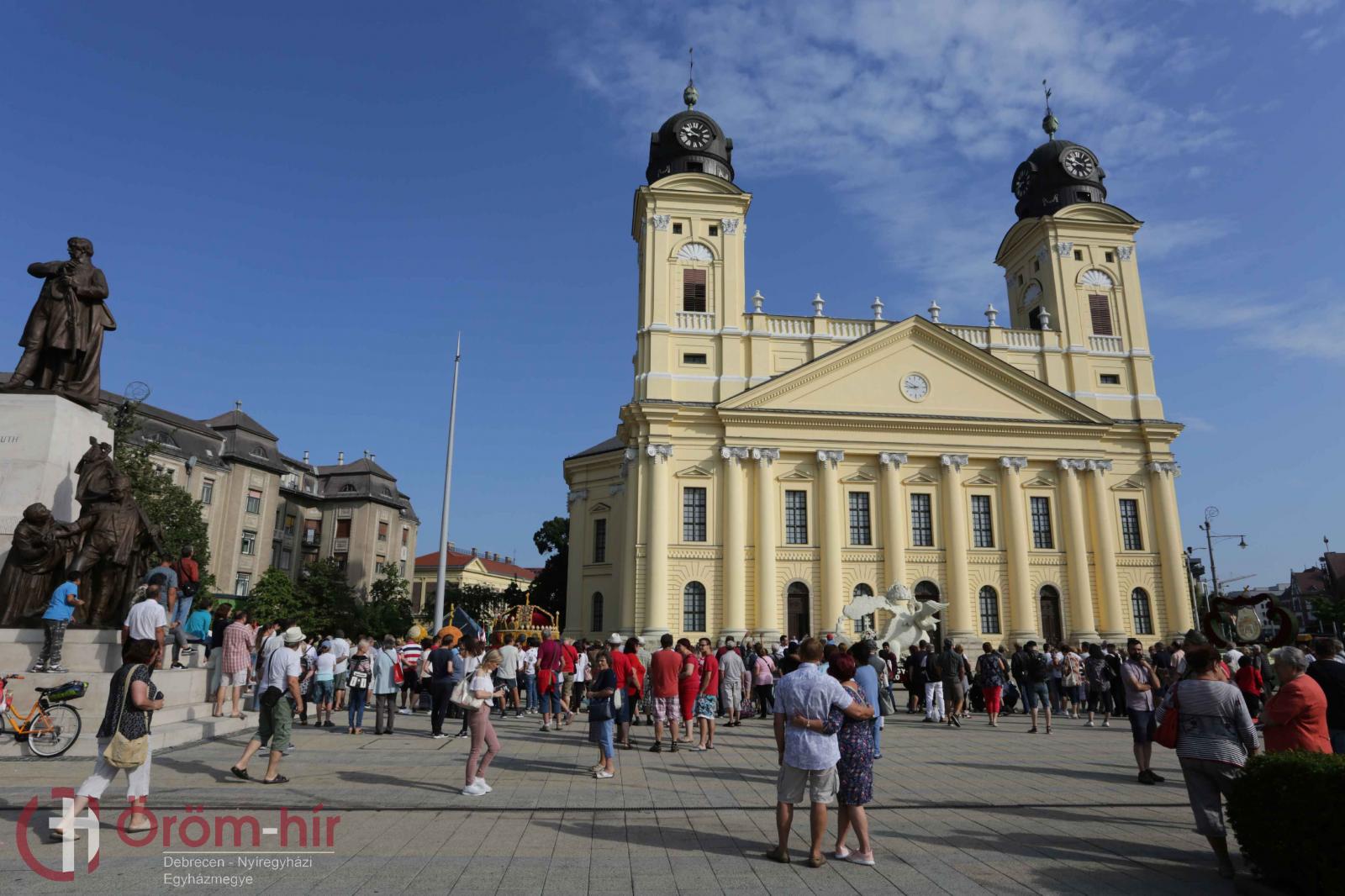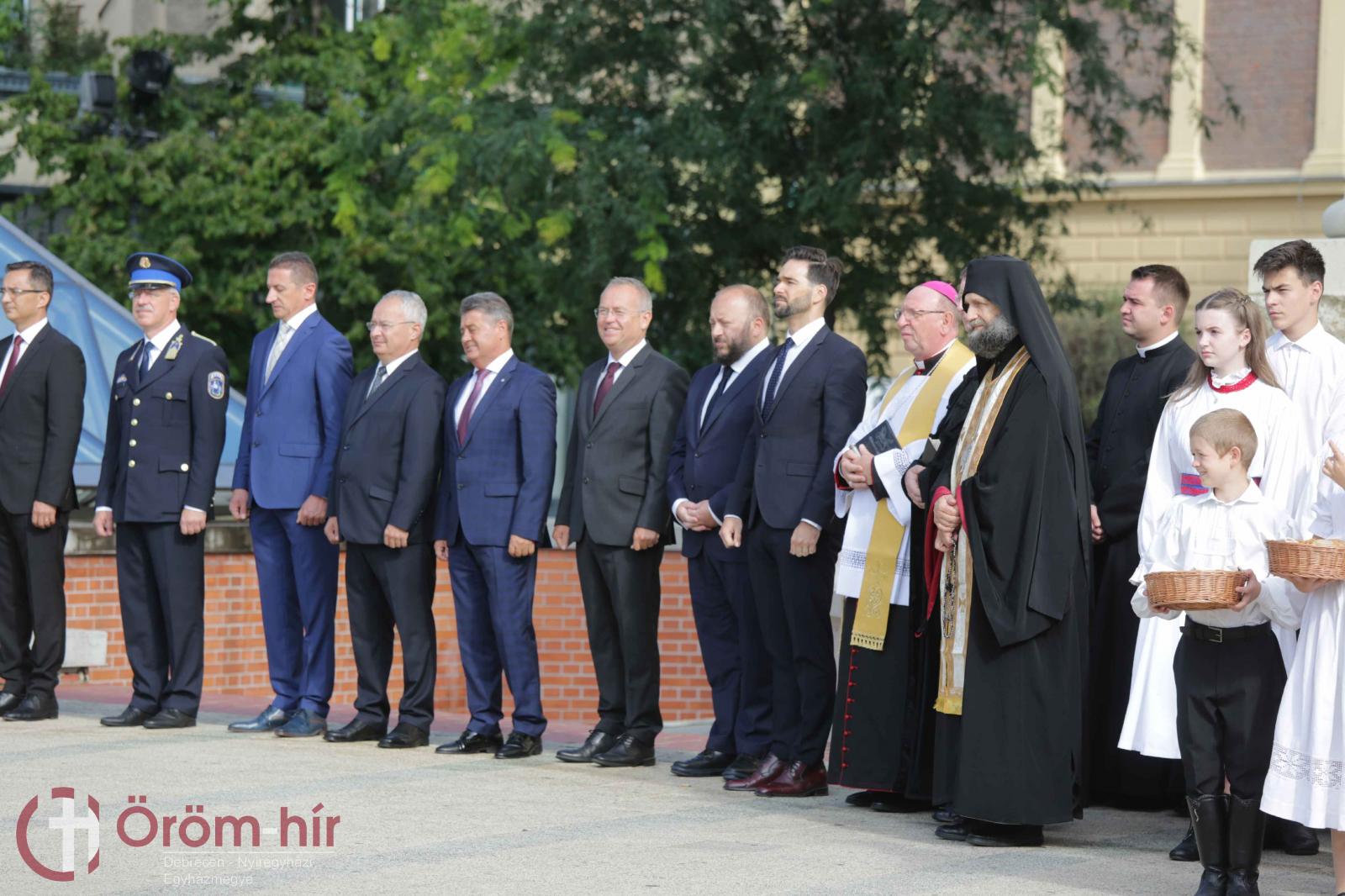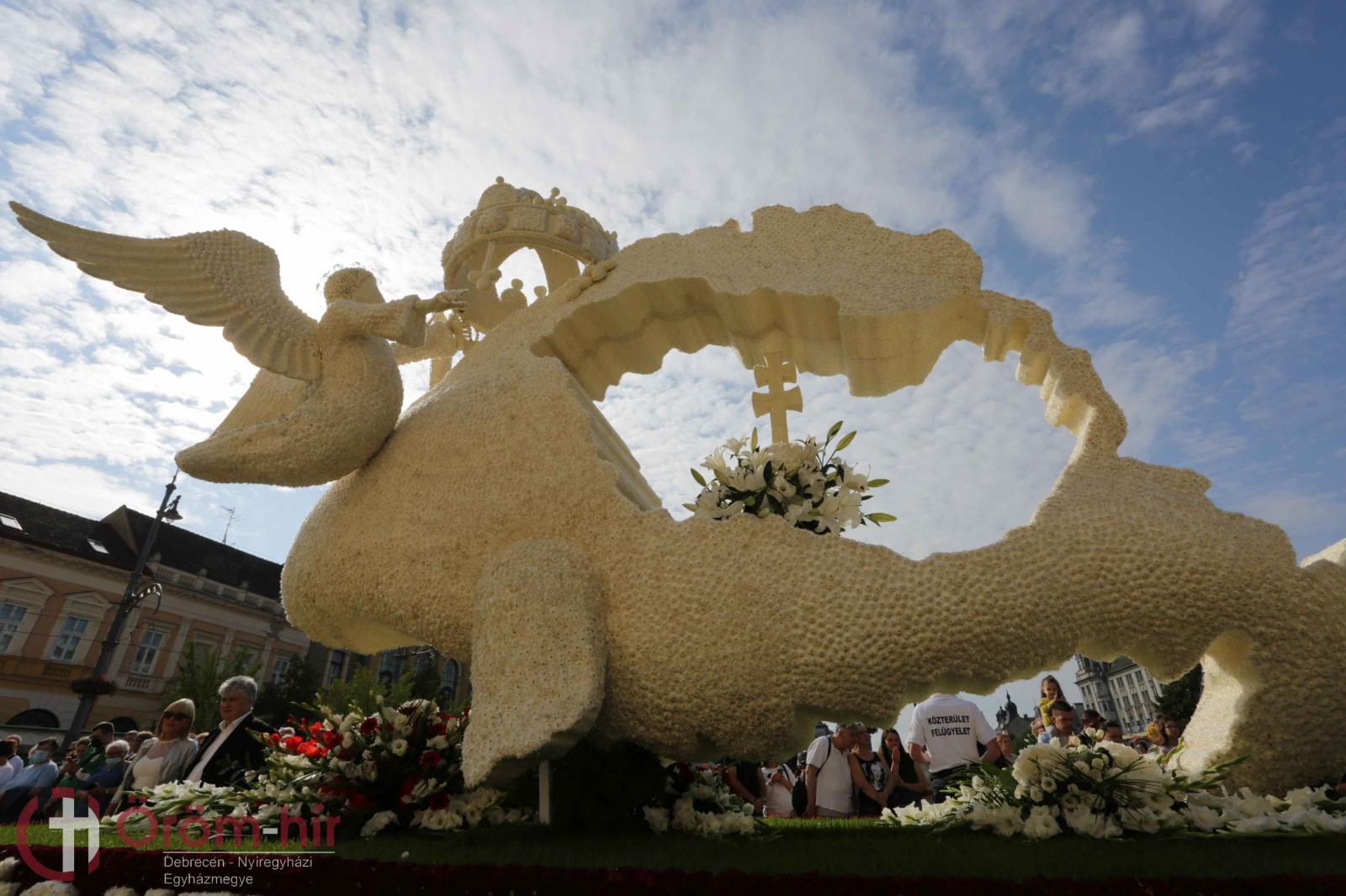 Harangzúgás törte meg a szokatlan csöndet az ünnepi kenyérszentelés előtti percekben, Debrecen főterén, a Kossuth téren. A szokásos karneváli hangulat, színkavalkád, a táncosokkal, külföldi együttesekkel, zenekarokkal kísért virágkocsik felvonulása ezúttal elmaradt, és csak a téren kiállított virágkompozíciók jelezték, hogy elkezdődött augusztus 20-a, Szent István király ünnepe. Az ünnepélyes zászlófelvonás és a Himnusz eléneklése utáni, hagyomány szerinti kenyérszentelés viszont változatlanul nagy méltósággal megtörtént a történelmi egyházak és a város vezetésének, valamint Debrecen lakosságának részvételével.