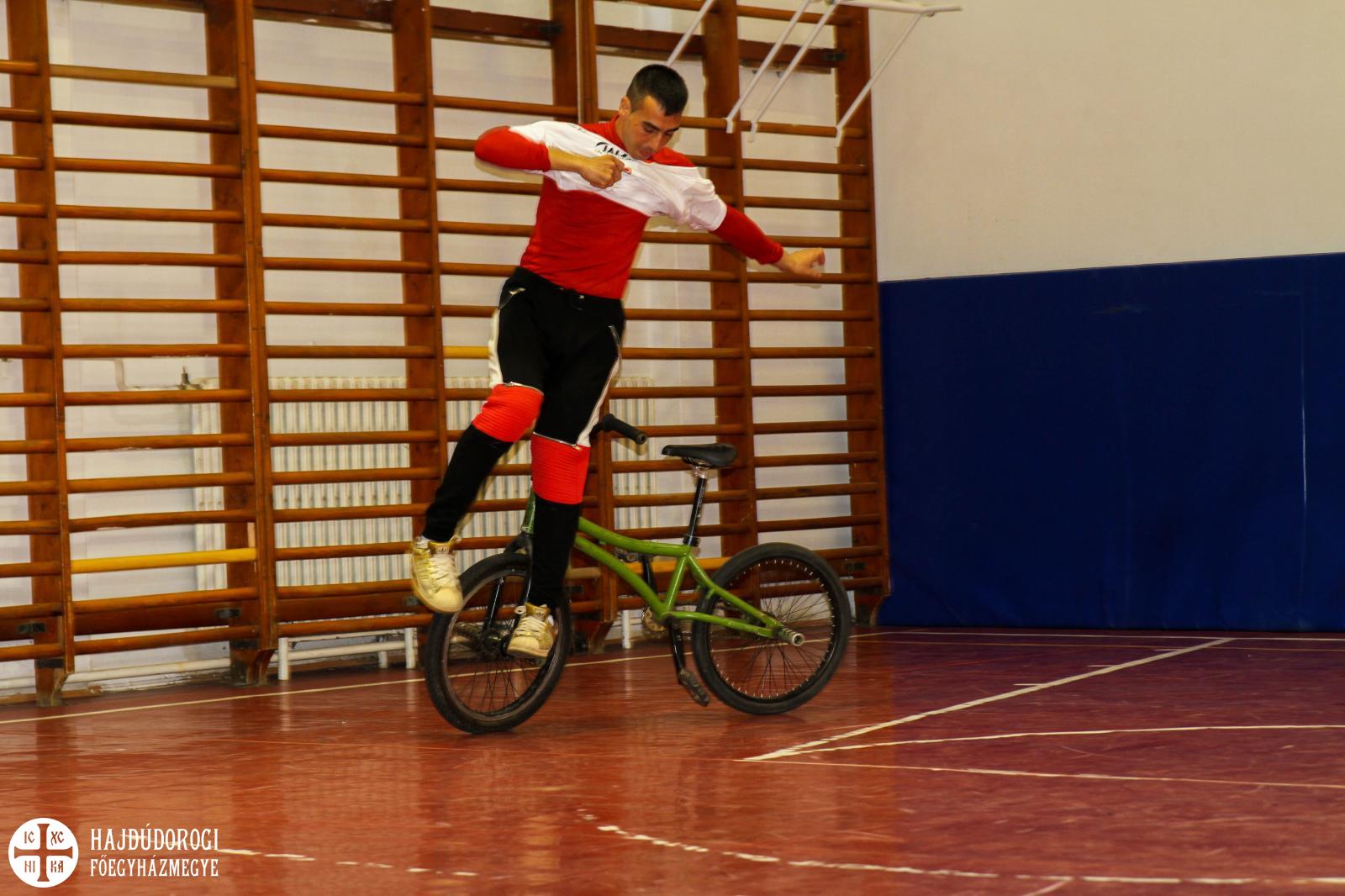 A hajdúhadházi fiatalember számos magyar rekordot állított már fel. Ő volt például, aki egy 22 emeletes épületből úgy lépcsőzött le, hogy közben végig a homlokán egyensúlyozott egy labdával. Idén októberben úgy döntött, hogy egy korábbi kerékpáros rekordját dönti meg: a bicaj első tengelyén állva körbe-körbe kerekezve vállalta, hogy minél többször veszi le és vissza fel a pólóját. Ez eddig 12-szer jött neki össze. Most nagyközönség előtt kísérelte meg ezt túlszárnyalni.