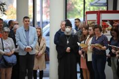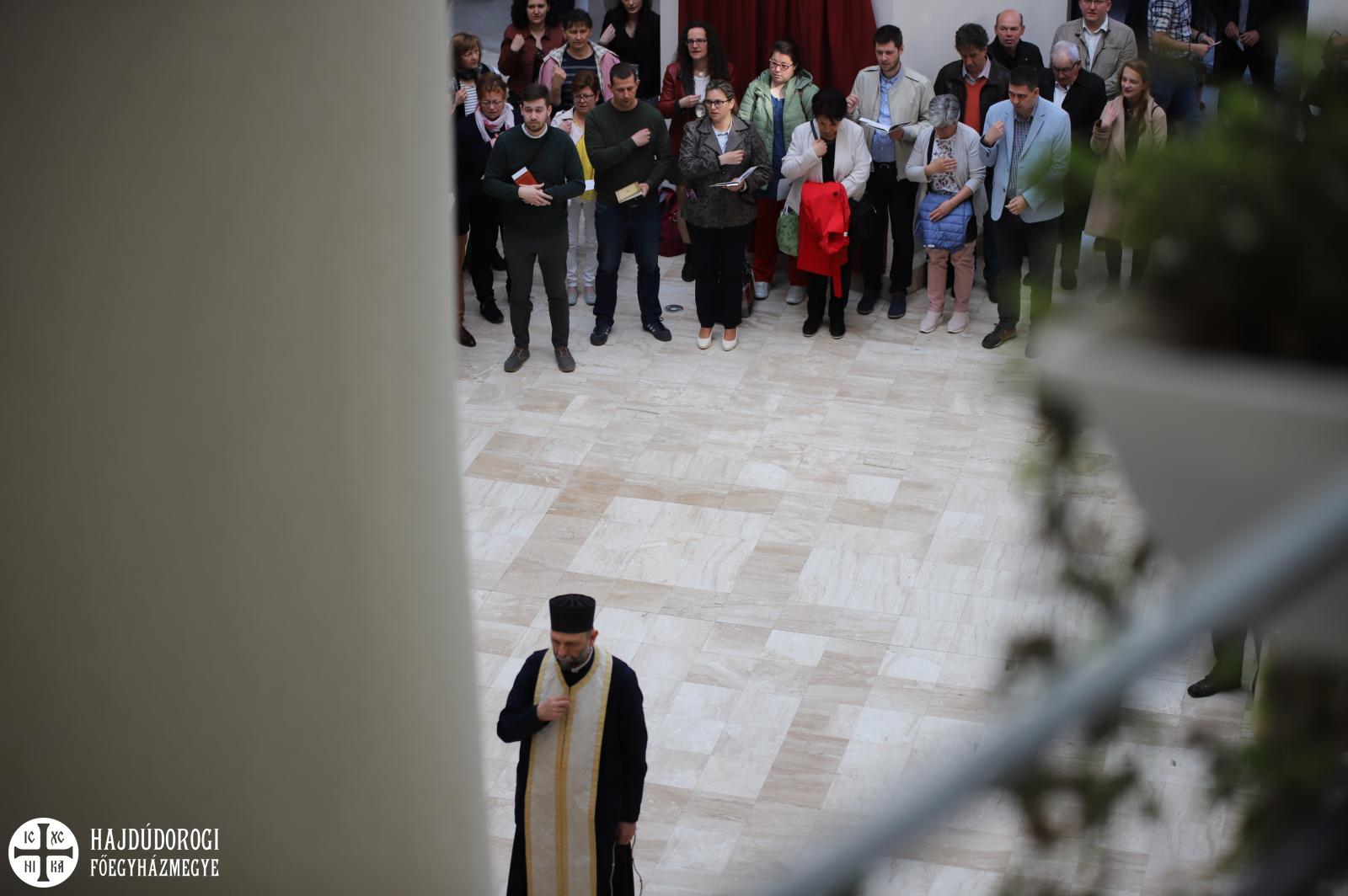 A Petőfi téri székházban imaórával kezdődött a nap, melynek végén Fülöp metropolita atya köszöntötte a csaknem 130 munkatársat. A főpásztor röviden ismertette az épület történetét, ami éppen öt éve ad otthont a Metropólia és a Főegyházmegye központi irodáinak.