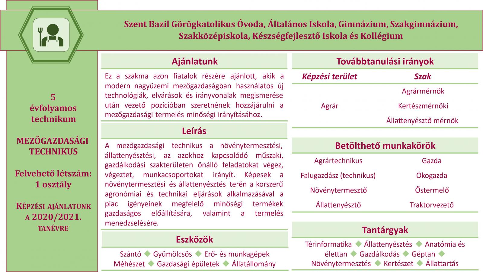 Az iskola történeti múltja kötelez, az iskola technikumi képzése egyaránt erre a múltra, a hagyományokra és kötelezettségekre, másrészt a munkaerő-piaci követelményekre épül. Mindezek alapján a 8. osztályos, szakmát és érettségi vizsgát szerezni akaró diákok számára a mezőgazdasági technikus és a vendégtéri szaktechnikus szakképesítést ajánljuk. A mezőgazdasági technikus szakmát tanuló diákok az iskola saját tangazdaságában, a vendégtéri szaktechnikusok pedig az iskola saját tankonyháján sajátíthatják el a szakma gyakorlatát.