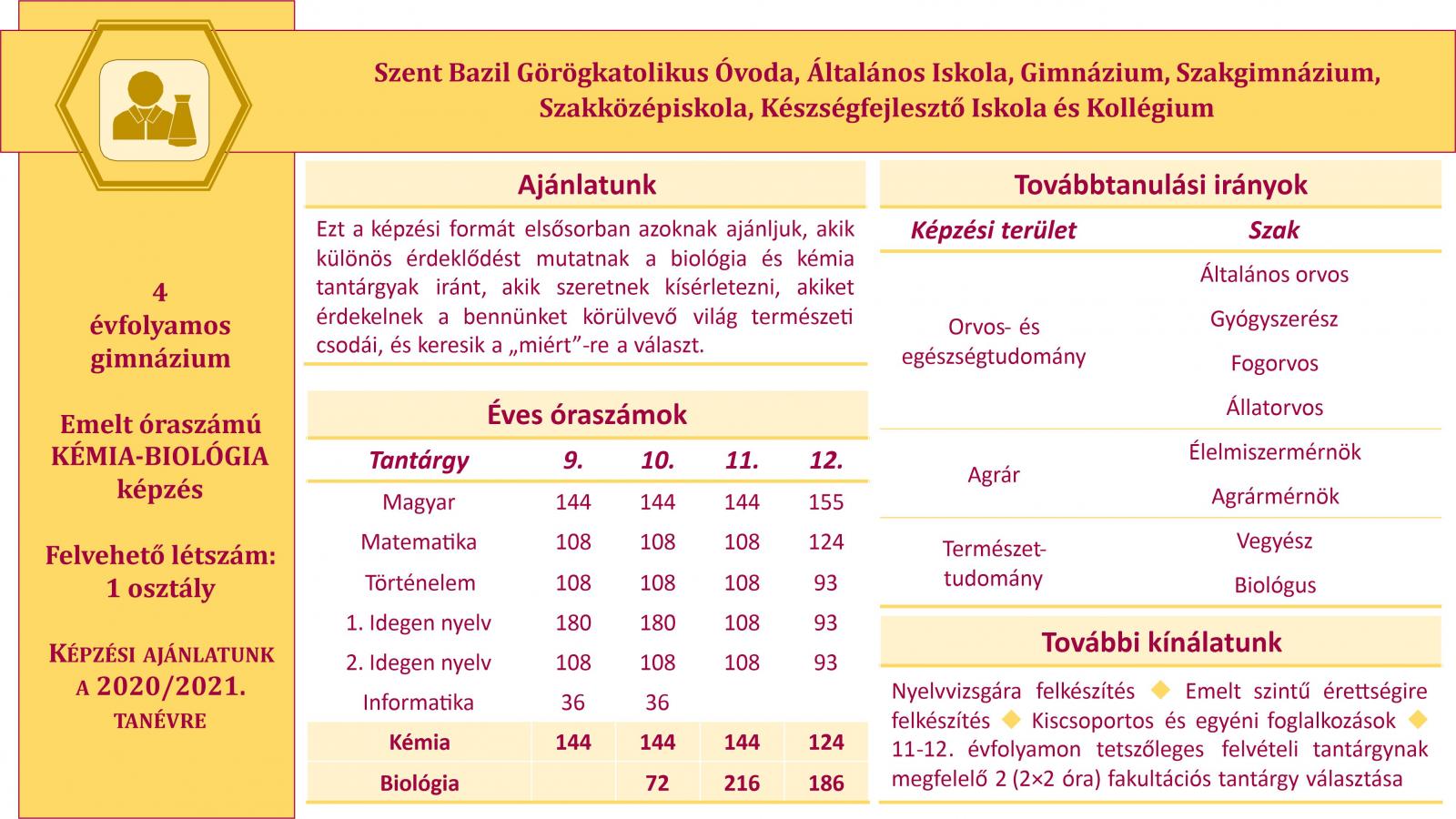 Továbbtanulási lehetőség: vegyész, biológus, általános orvos, állatorvos, fogorvos, gyógyszerész, ápolás és betegellátás, tanár, élelmiszermérnök, agrármérnök.