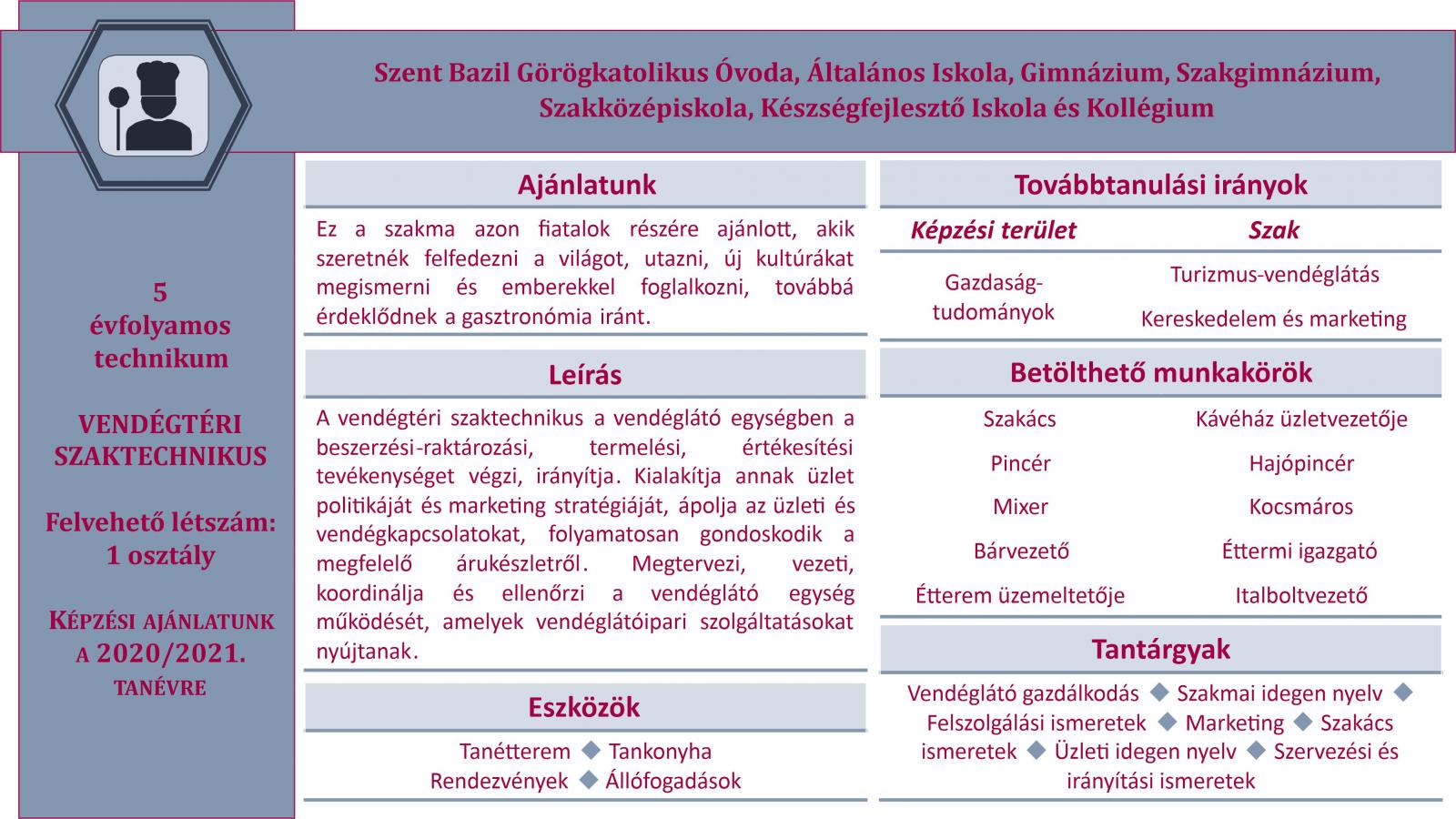 Továbbtanulási lehetőség: turizmus-vendéglátás, kereskedelem és marketing. Betölthető munkakörök: szakács, kávéház üzletvezetője, pincér, hajópincér, mixer, kocsmáros, bárvezető, éttermi igazgató, étterem üzemeltetője, italboltvezető