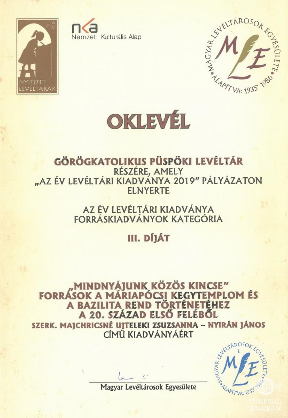 A Magyar Levéltárosok Egyesülete tavaly is meghirdette Az év levéltári kiadványa pályázatát, a legjobbnak ítélt levéltári kiadványokat három kategóriában nevezték a pályázatra országszerte: monográfiák, tanulmánykötetek és levéltári adatbázisok mellett a forráskiadványok kategóriájában. Ez utóbbiban a Görögkatolikus Püspöki Levéltár által indított legújabb kiadvány, a Mindnyájunk közös kincse lett a harmadik helyezett.