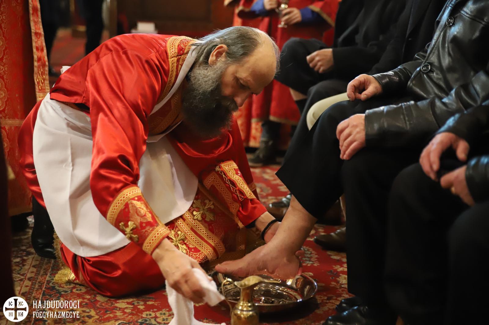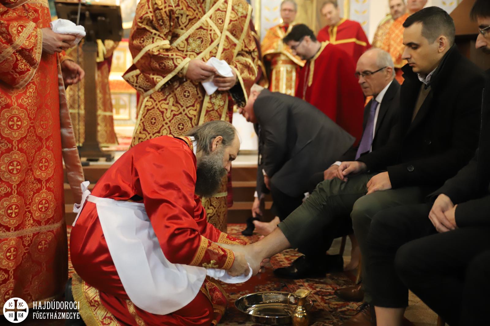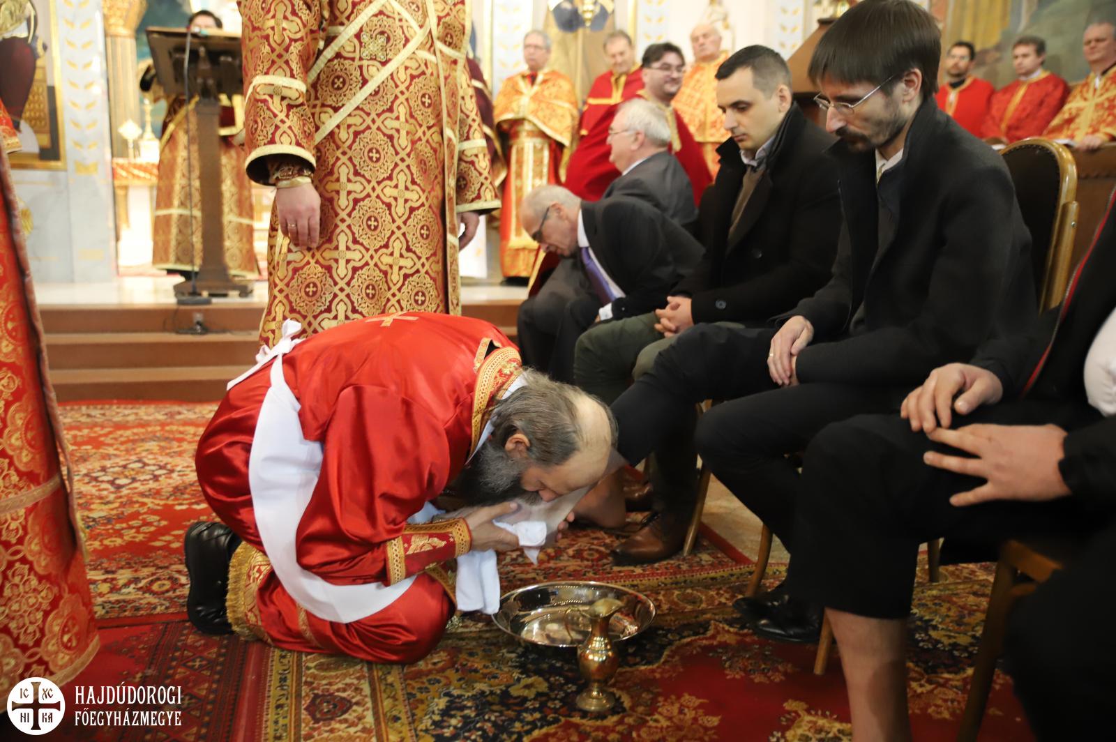 Debrecenben 12 egyházi és világi ember lábát mosta meg Kocsis Fülöp metropolita a főszékesegyházban.