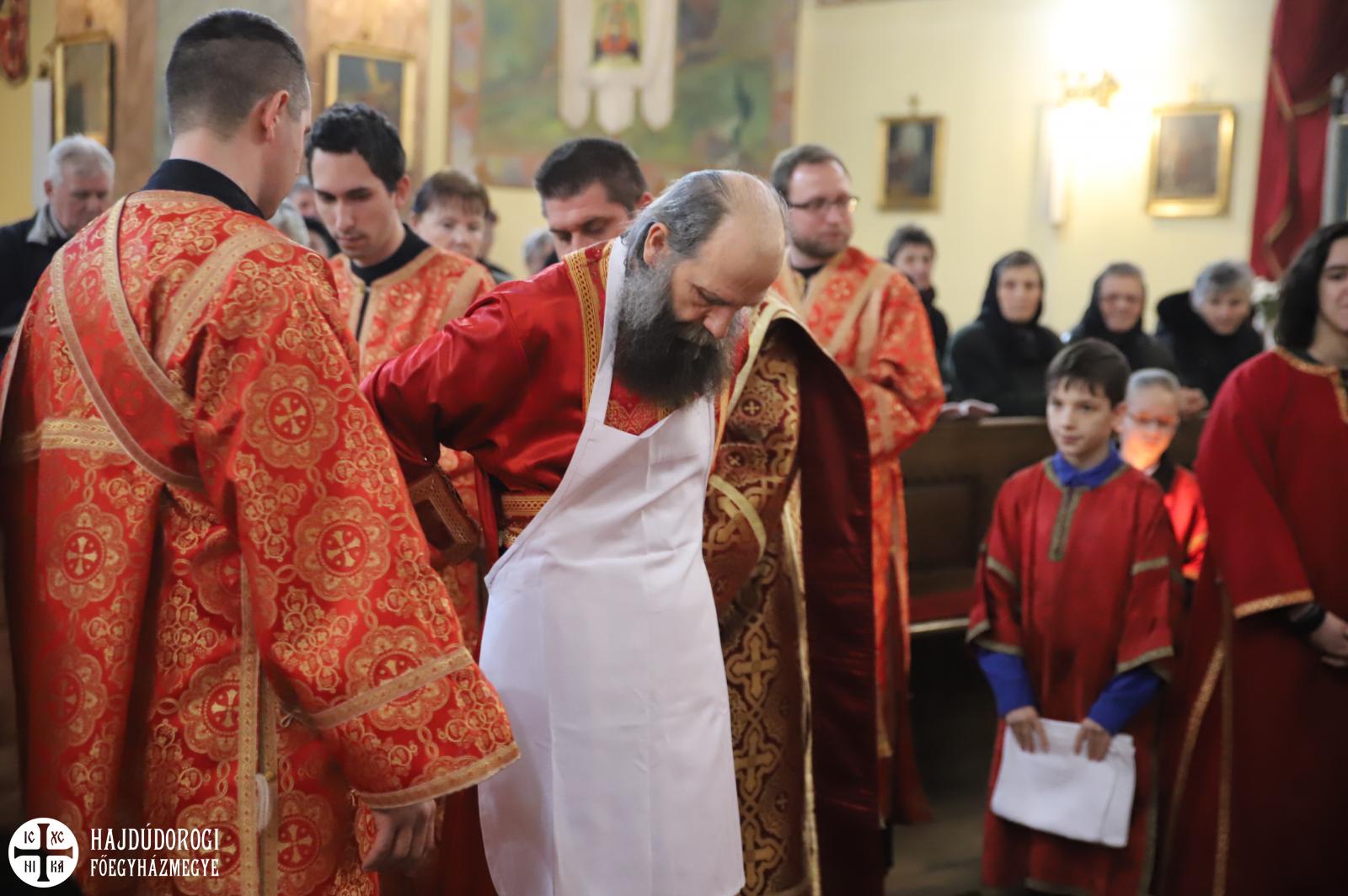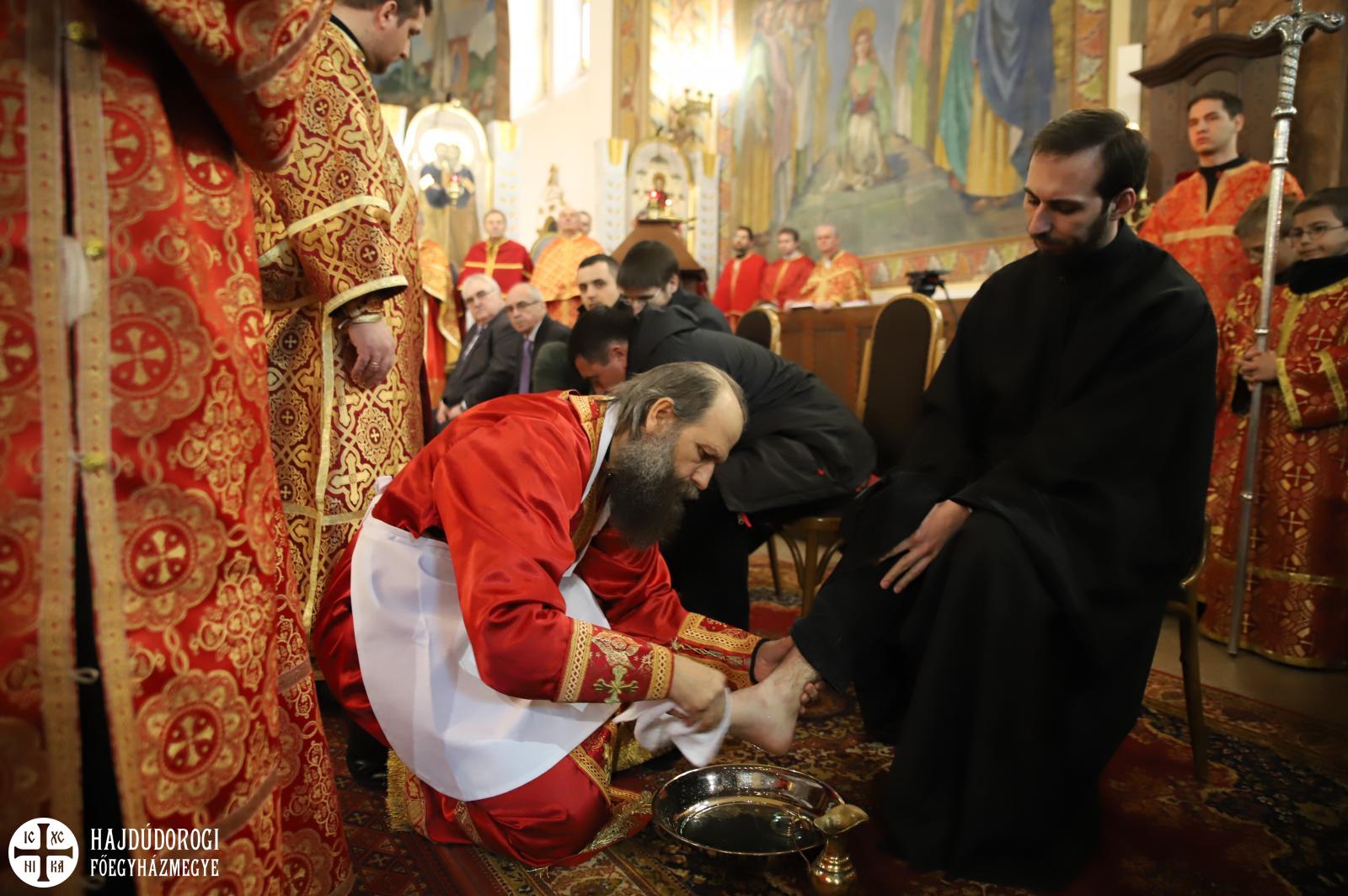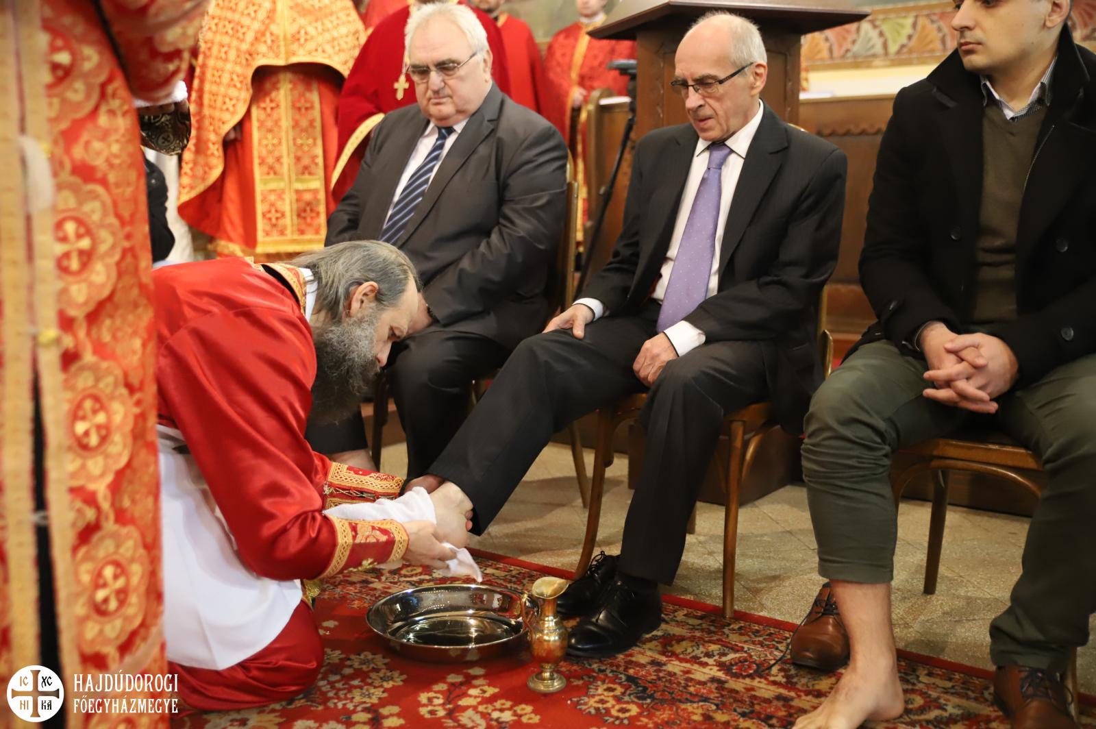 Debrecenben 12 egyházi és világi ember lábát mosta meg Kocsis Fülöp metropolita a főszékesegyházban.