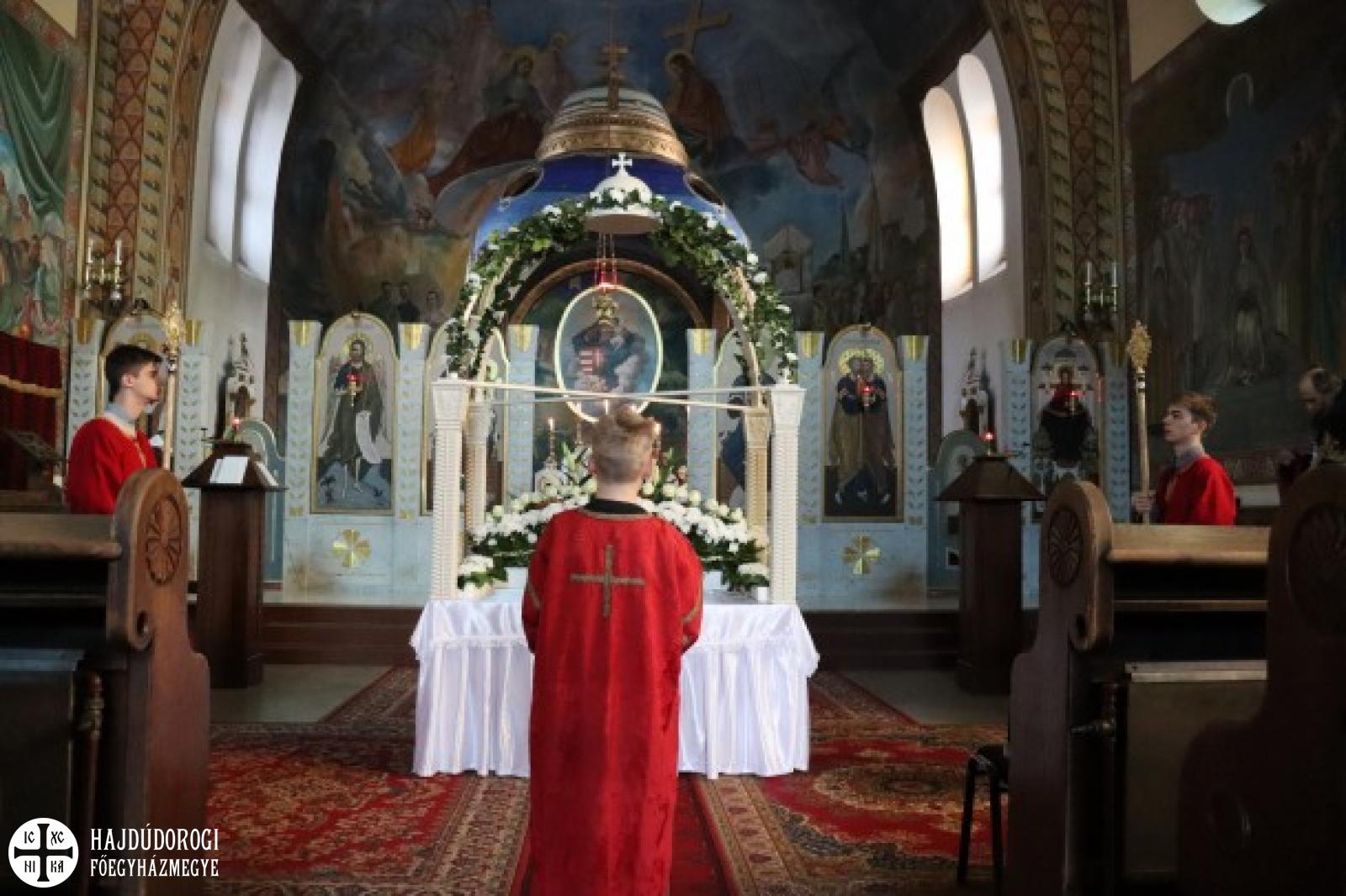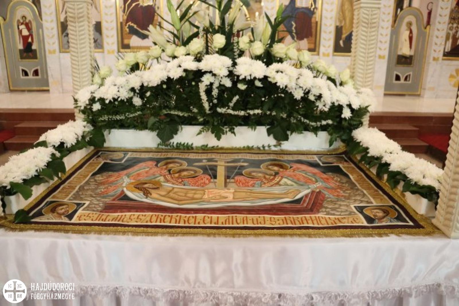 A vecsernye végén Kocsis Fülöp metropolita megtömjénezte az oltárra terített, Krisztus testét ábrázoló plascsenyicát (sírlepel), amit aztán a magasba emelve vittek körbe – idén csak a főszékesegyházon belül, ugyanis a koronavírus-járvány miatt elmaradt a körmenet. Majd ezt a liturgikus kendőt elhelyezték a virágokkal díszített szentsíron. A templom egész éjjel nyitva lesz, idén azonban metropolita atya külön kérte a híveket, hogy ne érintsék meg a leplet.