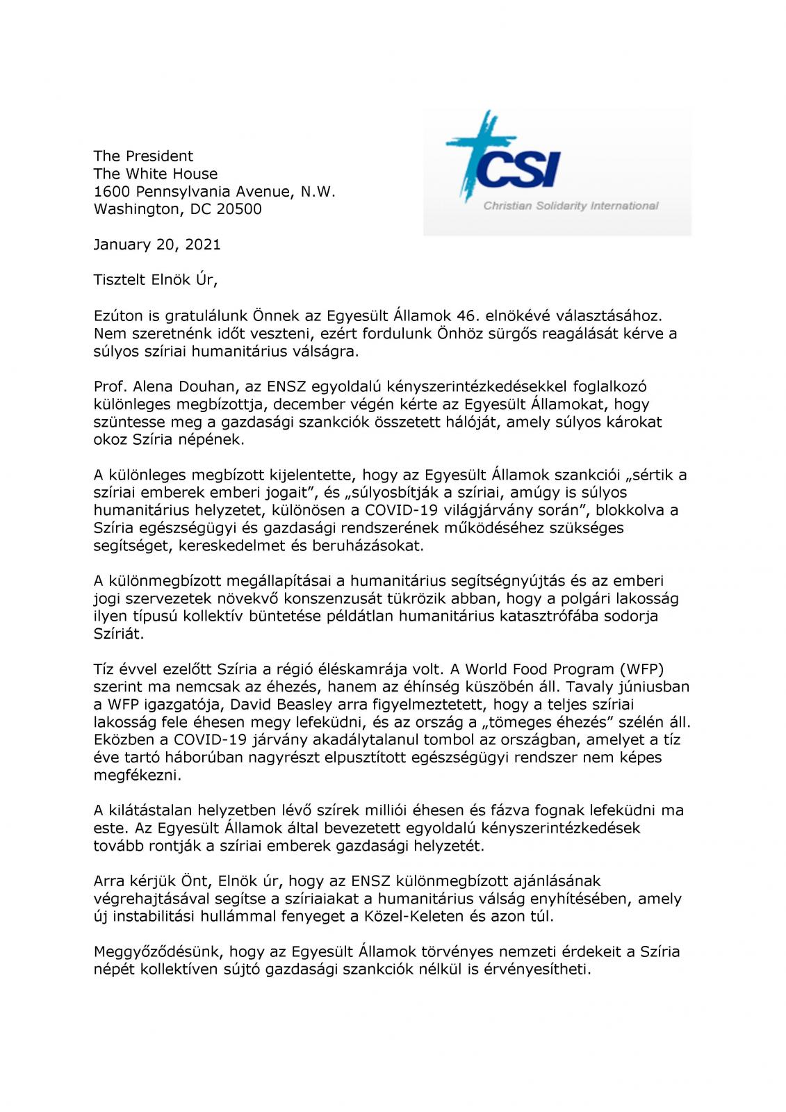 Az üzenet így zárul: „Úgy gondoljuk, hogy az Egyesült Államok jogos nemzeti érdekei anélkül érvényre juttathatók, hogy a szíriai népet gazdasági eszközökkel sújtanák. ”