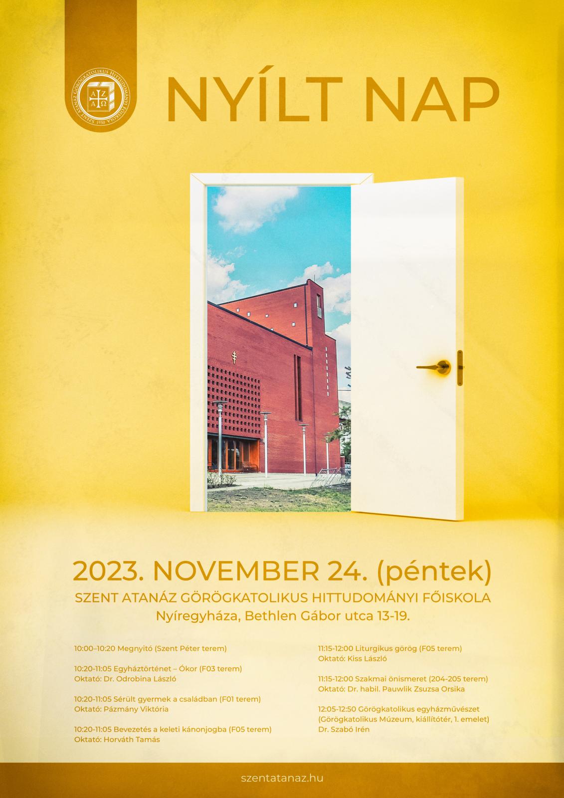 A Szent Atanáz Görögkatolikus Hittudományi Főiskola nyílt napot rendez 2023. november 24-én, pénteken. A program 10 órakor kezdődik a Szent Péter-teremben, melyet követően a következő órákat lesz lehetősége megtekinteni az érdeklődőknek: