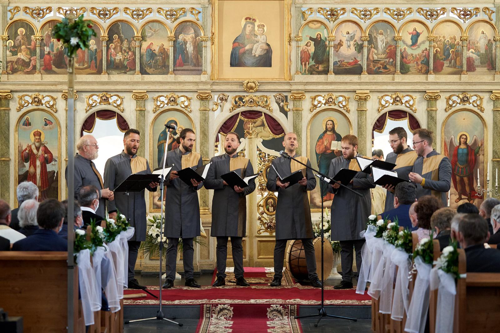 A Szent és Isteni Liturgia énekszolgálati rendjéhez kapcsolódóan, a Szent Efrém Férfikar előadásában a Mennyei király magyar és ószláv nyelven, a Triszágion Athosz-hegyi, görög-ószláv-magyarul, a Kerubének a sajópálfalai irmologionból ószlávul, a Szent, szent, szent... ószlávul, a Téged éneklünk... magyarul, a Mi Atyánk... – szír dallamra, arámi nyelven csendült fel. Ezt követően az énekesek koncerttel is kedveskedtek a jelenlévőknek. Elhangzottak Rachmaninov Bogorodice, Bubnó Lőrinc feldolgozásában az O Măcu?ă Sfântă, Kodály Semmin ne bánkódjál Krisztus szent serege, valamint X. Bölcs Alfonz: Santa Maria amar (Szeressük a Szűzanyát) művei.