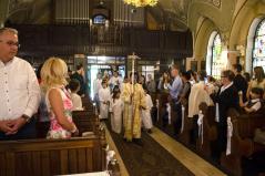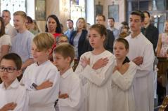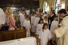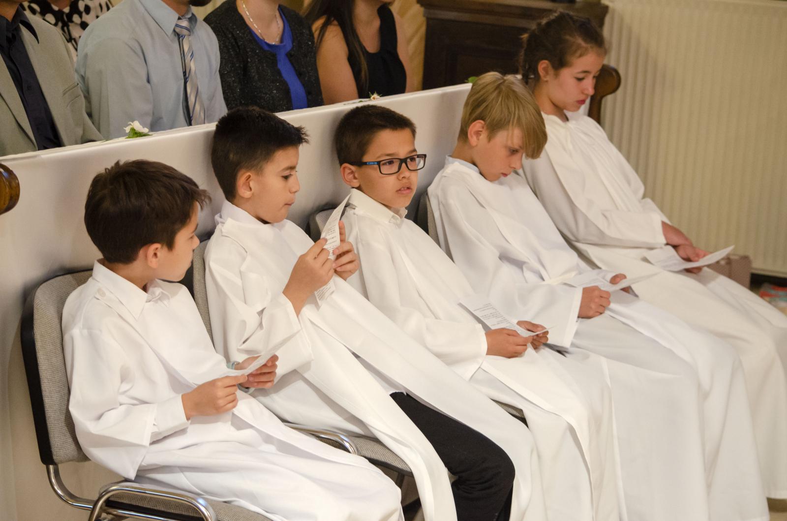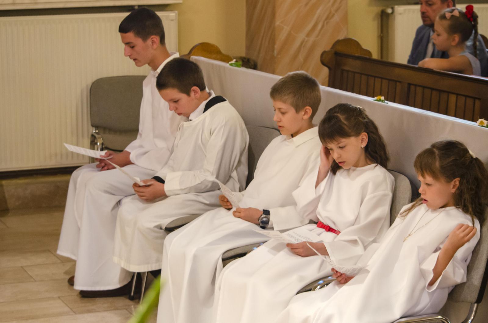 Nagy nap volt ez az itt élő hívek számára, hiszen nagyon rég nem volt ilyen relatíve nagy létszámú elsőáldozás közösségünkben. Gyermekeink szeptember óta készültek arra, hogy idén májusban, a Húsvét utáni időszakban magukhoz vehessék Jézus Krisztus valóságos testét és vérét.