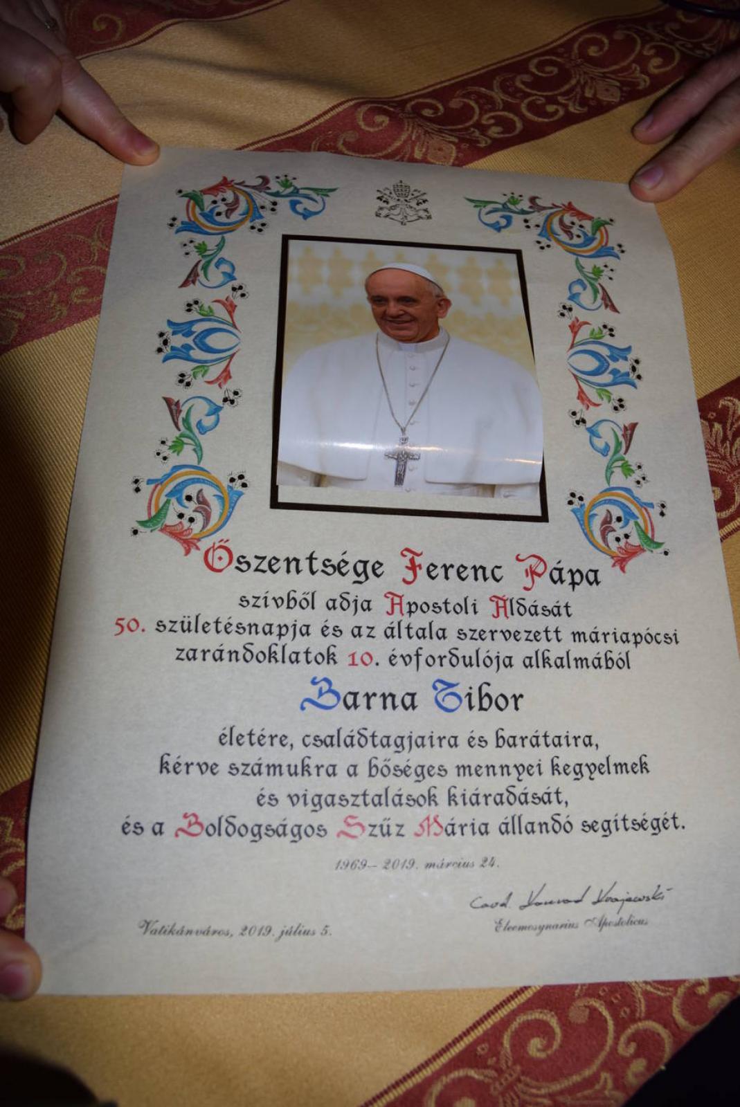 A Szentatya áldásáról írásos oklevelet is kapott.