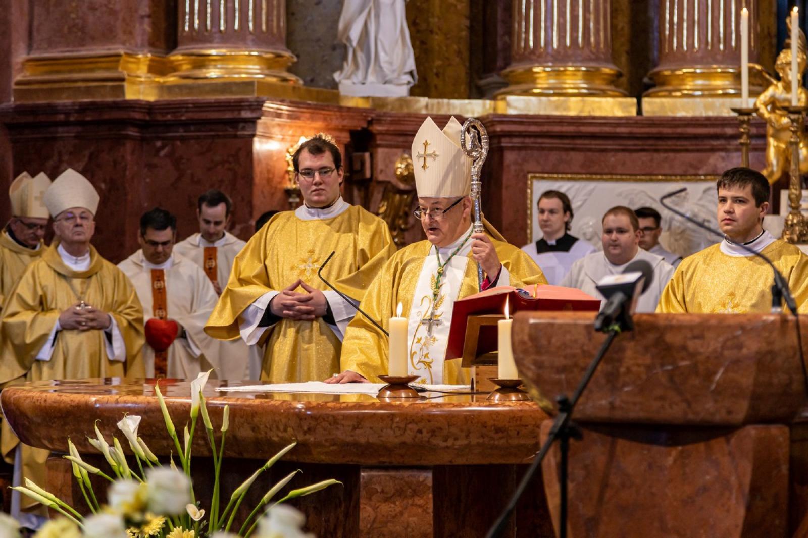 A hálaadó szentmise elején Ugrits Tamás pasztorális helynök tolmácsolta Ferenc pápa áldását és köszöntő szavait a főpásztornak. A Szentatya méltatta Spányi Antalnak az Esztergom-Budapesti Főegyházmegyében, majd a Székesfehérvári Egyházmegyében mutatott tevékeny lelkipásztori buzgóságát, kitartását, a nehézségek között is megőrzött kiválóságát, a papokról és a Krisztus-hívőkről való gondoskodását, valamint a Magyar Katolikus Püspöki Konferenciáért végzett munkáját. „A Boldogságos Szűz Mária, az Apostolok Királynője közbenjárása által nagy szeretettel árasztjuk áldásunkat Rá és nyájára, kölcsönösen kérjük imáit, hogy péteri szolgálatunkat betölthessük” – fogalmazott üzenete zárásaként Ferenc pápa.