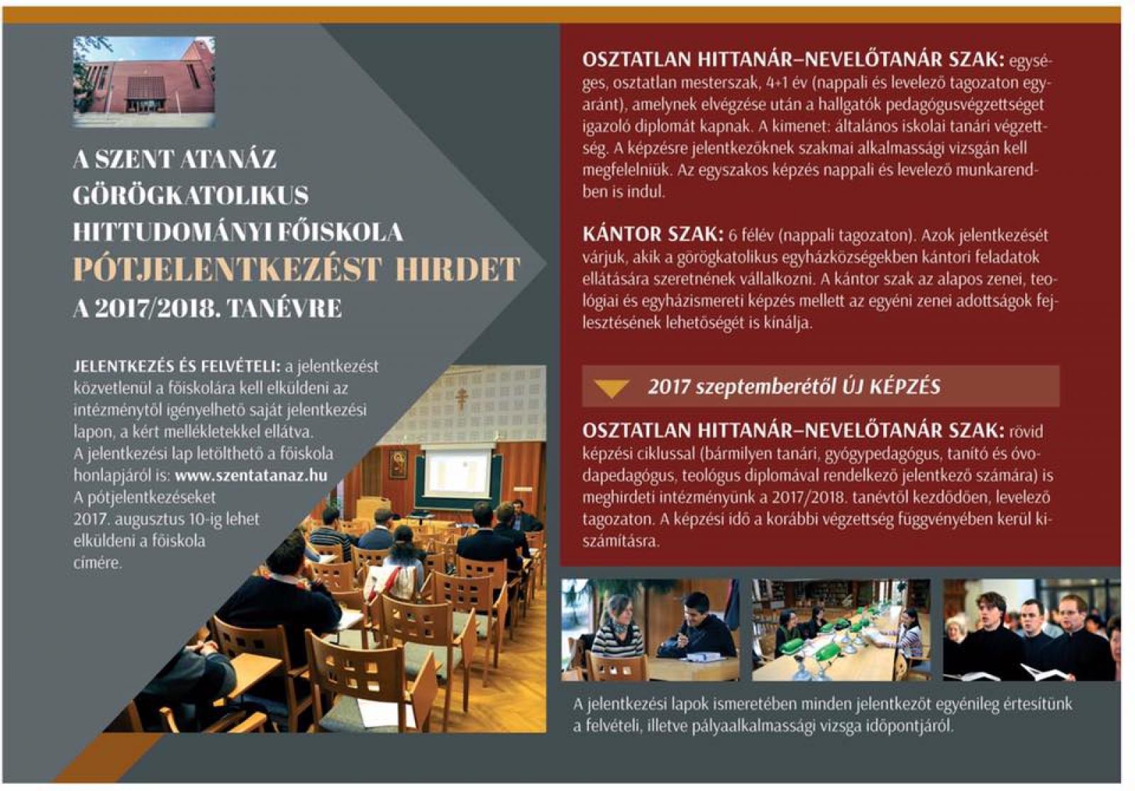 A Szent Atanáz Görögkatolikus Hittudományi Főiskola pótjelentkezést hirdet a 2017/2018-as tanévre. A jelentkezést közvetlenül a Főiskolára kel küldeni, méghozzá az intézmény saját jelentkezési lapján.