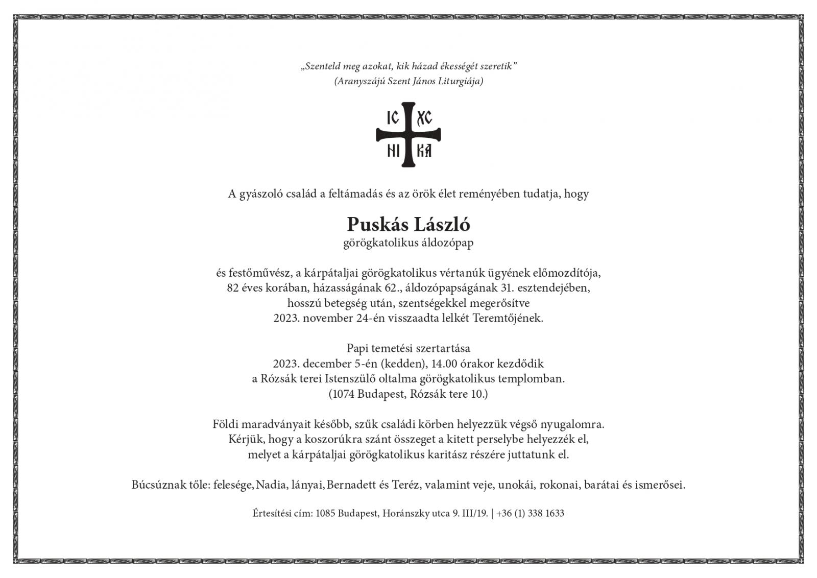 A gyászoló család a feltámadás és az örök élet reményében tudatja, hogy Puskás László görögkatolikus áldozópap és festőművész, a kárpátaljai görögkatolikus vértanúk ügyének előmozdítója, 82 éves korában, házasságának 62., áldozópapságának 31. esztendejében, hosszú betegség után, szentségekkel megerősítve 2023. november 24-én visszaadta lelkét Teremtőjének.