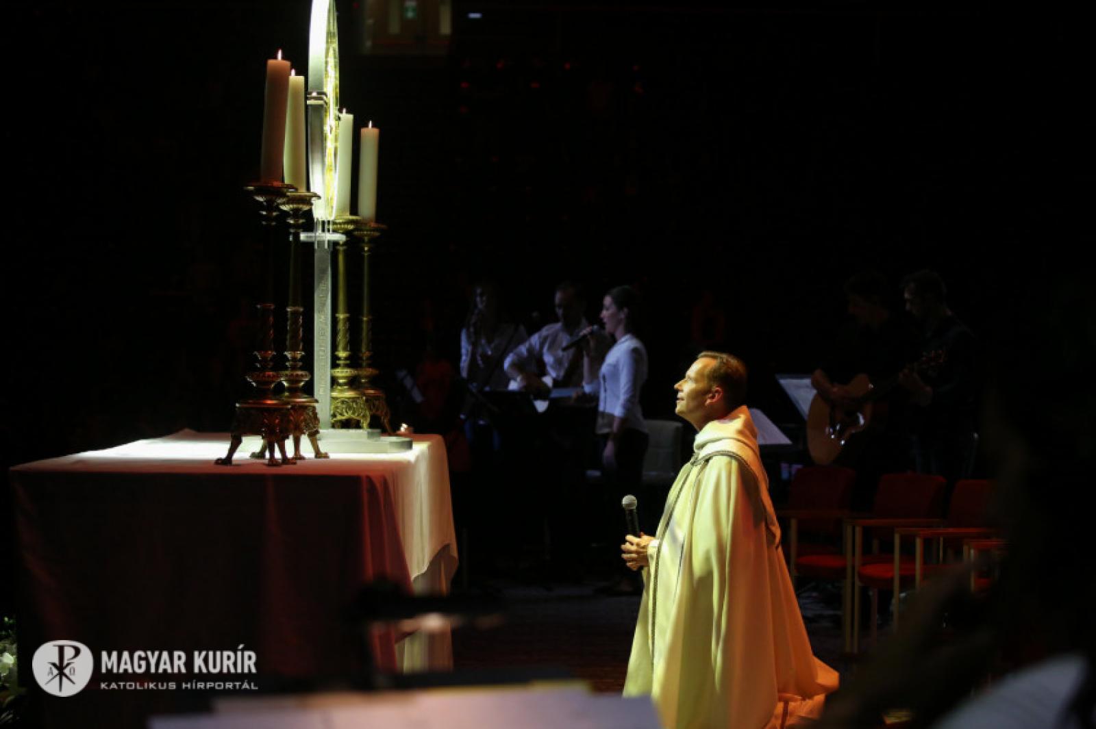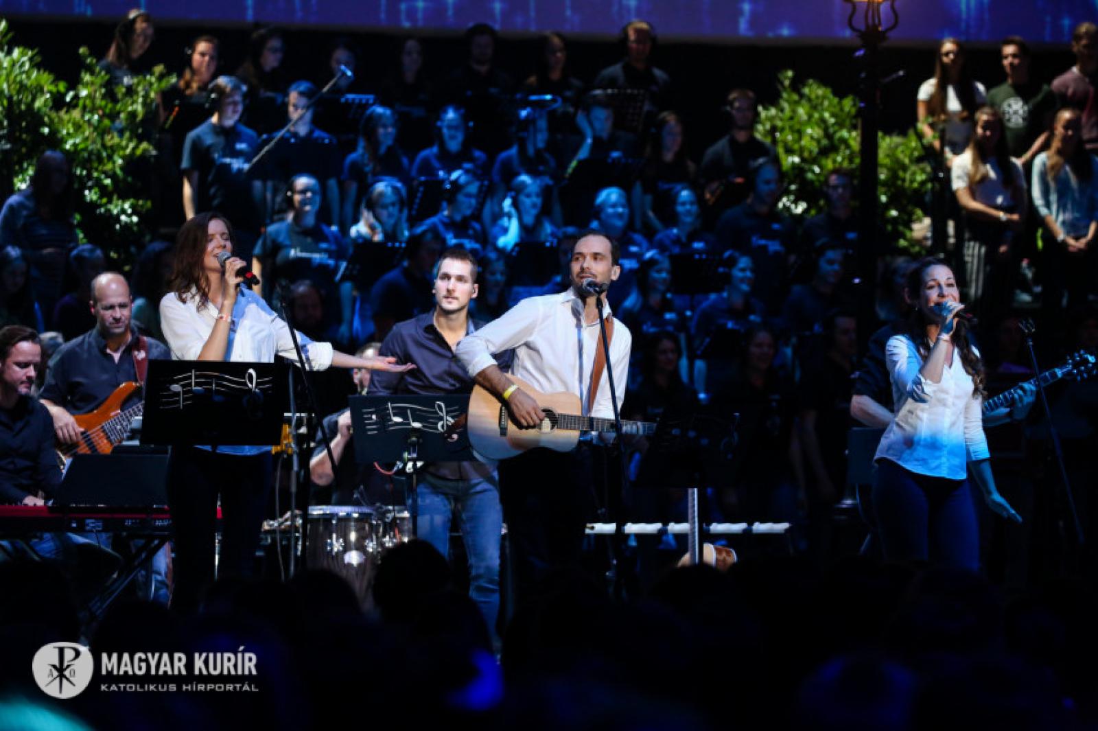 Az alkalomra összeállt csapatot Vízy Márton vezeti. „Jézus mellém állt...” – énekli. A háttérben hatalmas kivetítőn olvasható a dalszöveg, közelképben láthatjuk a zenészeket; a profizmus nyugalmával emelkedik felfelé az égbolt csillagait is idéző videómontázs. Rengeteg a fiatal, közülük néhányan már fel is állnak a székükről, énekelnek. „Áldott legyen az Úr neve” – ennek a dalnak az ereje már jól érződik, egyre többen felpattannak az ülőhelyükről, és akkor Vízi Márton azt mondja: „Szabad felállni, tapsolni, lelkendezni – és szabad nagyon szeretni.”