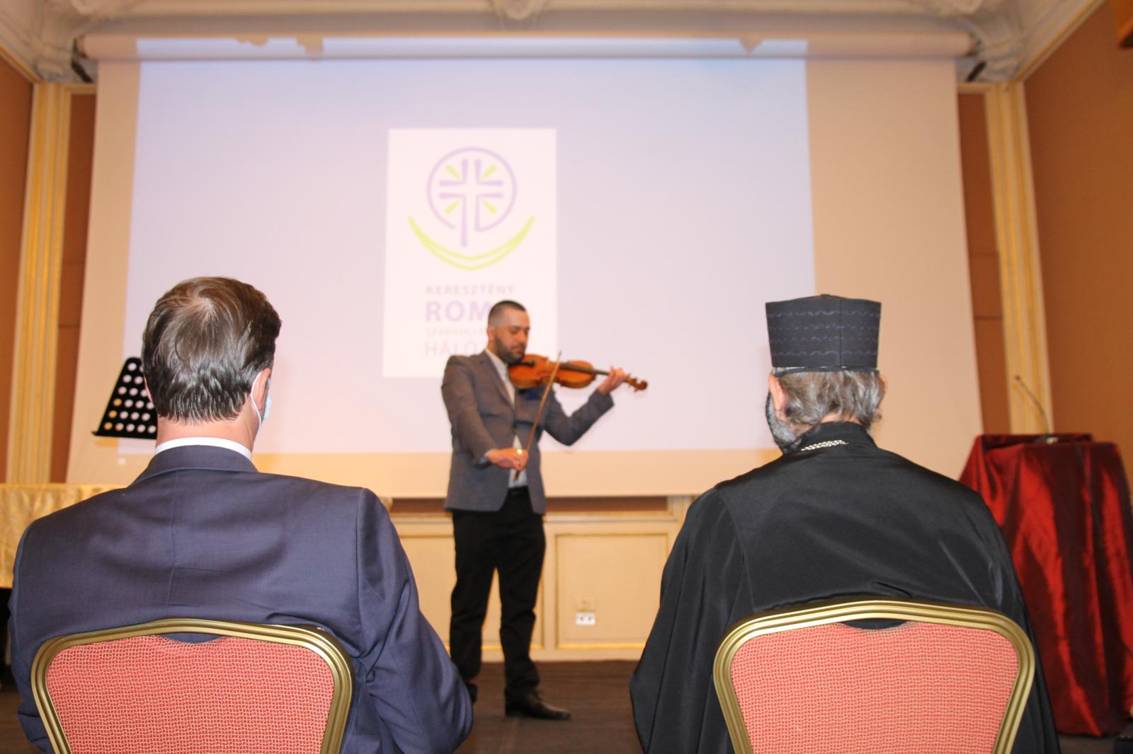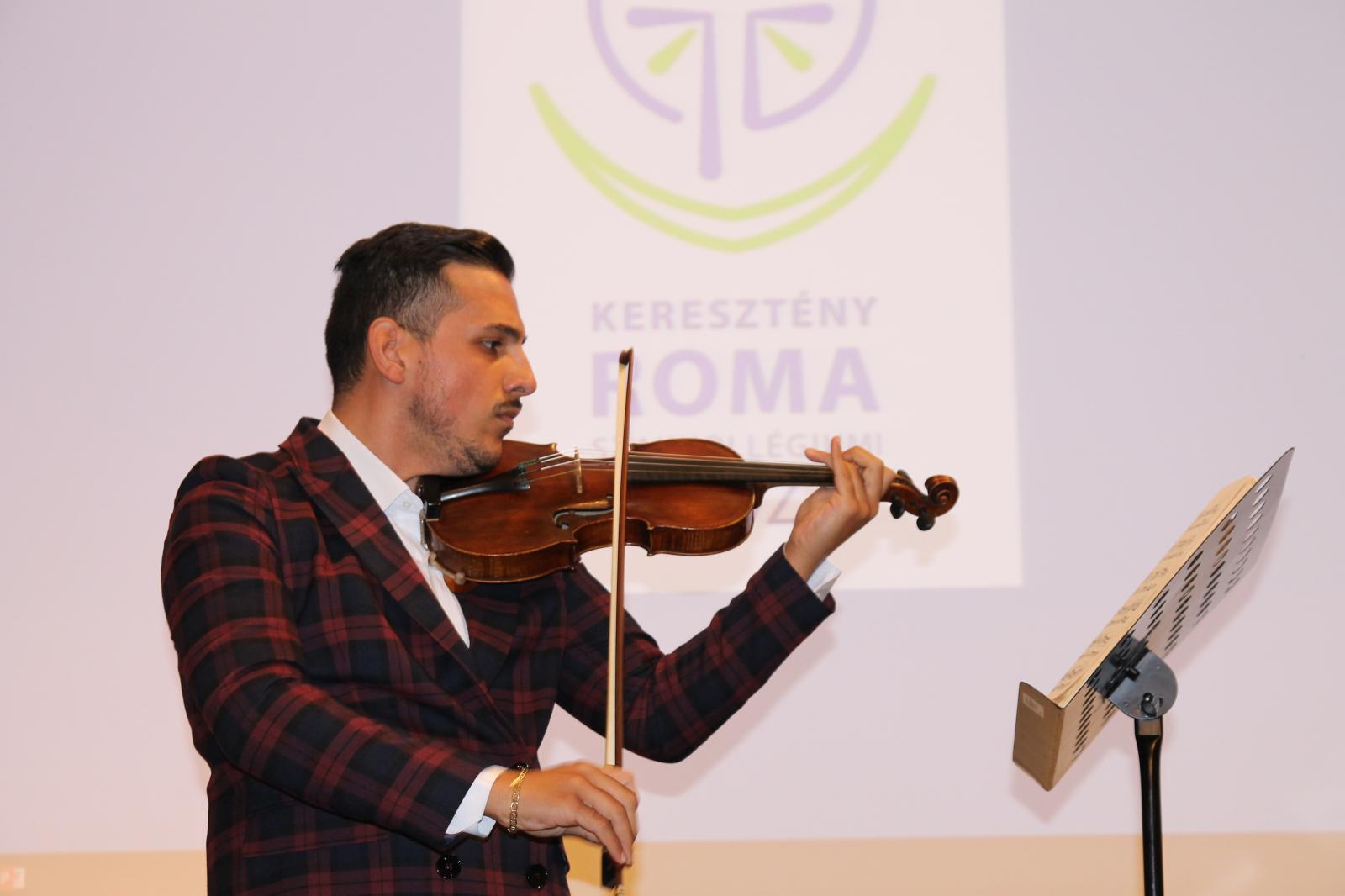 Sztojka Máté, a szegedi Keresztény Roma Szakkollégium hallgatójának hegedűjátéka nyitotta meg az estet: Schubert Ave Mariáját hallhatták a konferencia résztvevői.