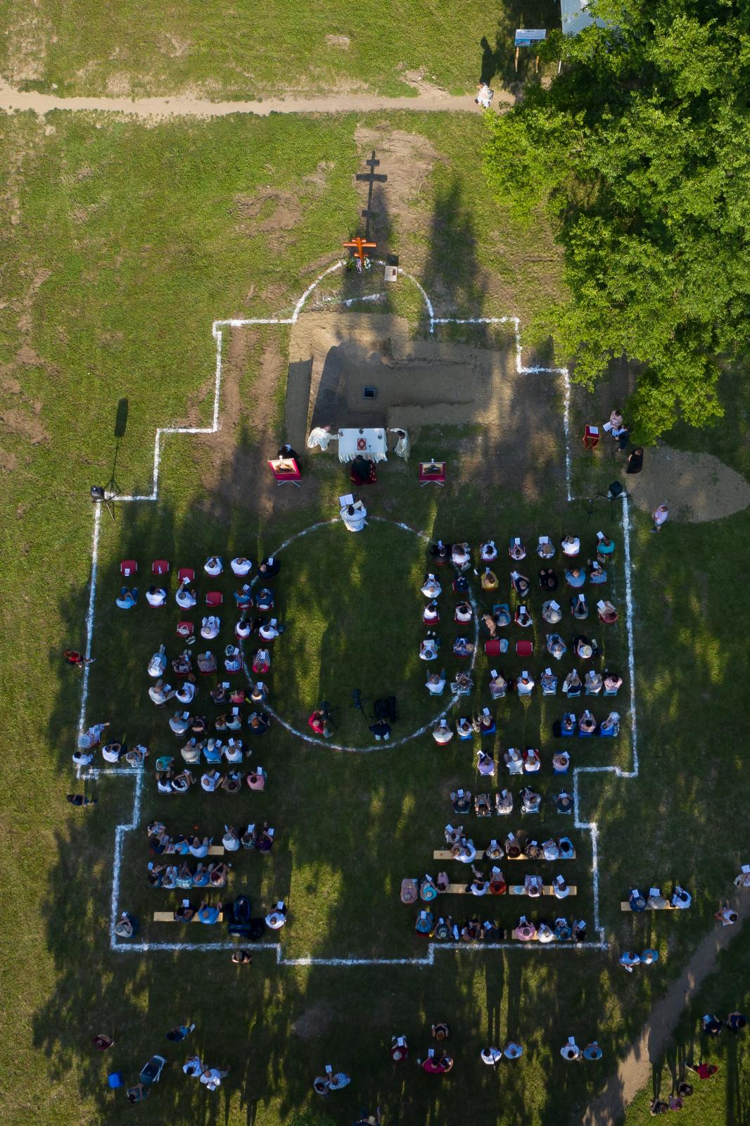 Leleményes megoldást talált ki a tócoskerti szervezőlelkészség a jeles napra: a templom határait kijelölték és a majdani oltár helyére egy fakeresztet illetve egy asztalt tettek ki, így szinte már egy „kész” lelki hajlékba érkezett a gyülekezet.
