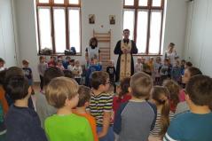 Szír Szent Efrém szír nyelven írt műveiben összefonódott a teológia és a költészet. Költői szépségű énekeinek köszönhetően a „Szentlélek hárfája” névvel illették. Hétfőn a lelki percek első felében a diakónus és egyháztanító életéről, munkásságáról mesélt a kicsiknek Gánicz László atya, majd ezt követően megszentelte az óvodát, csoportszobákat.